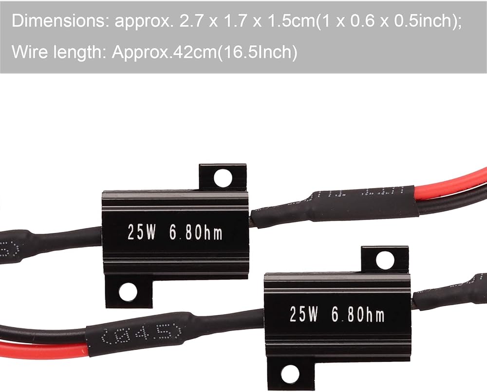 【LED Load Resistors Size】Dimensions: approx. 2.7 x 1.7 x 1.5cm(1 x 0.6 x 0.5inch); Wire length: Approx.20cm(7.8Inch)