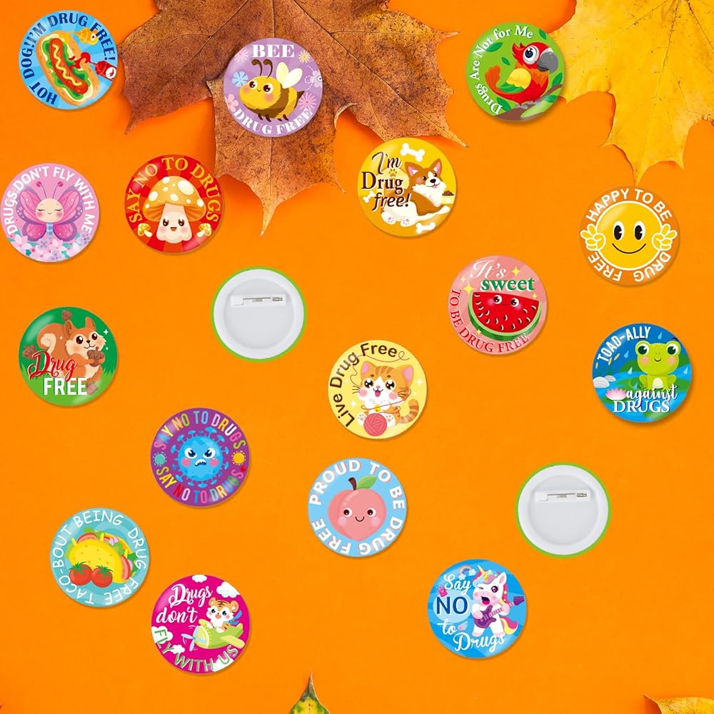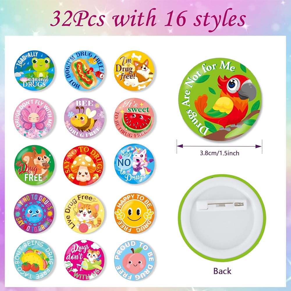 【Red Ribbon Week】You will get 32 cute button pins, divided into 16 different pattern designs, 2 for each style, each with a size of about 1.5 inches/3.8 cm, and the quantity is sufficient, which is convenient for you to use and share to meet your needs.