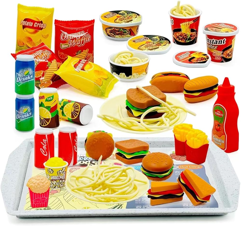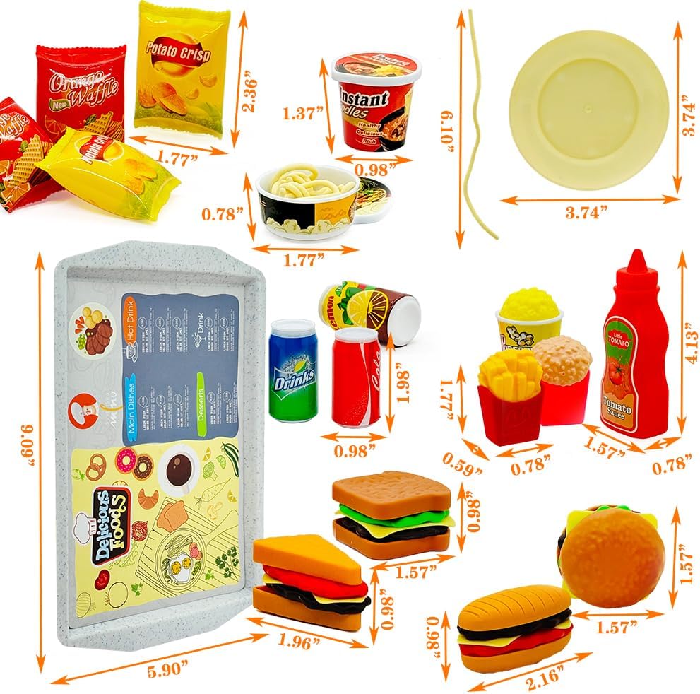 Pretend Play Kitchen Mini Foods Set for Kids Hamburger Fries Noodles Drink with Tray Playset,Play House Kitchen Accessories Role Toys Birthday Gifts for Boys Girls 3 4 5 Yrs (31Pcs Hamburger Chips)
