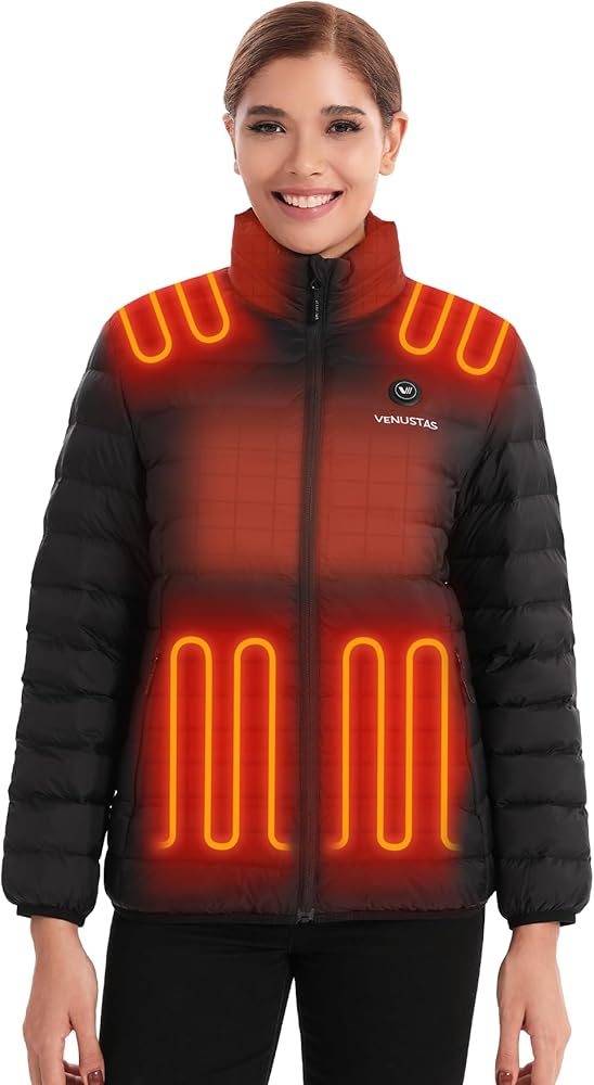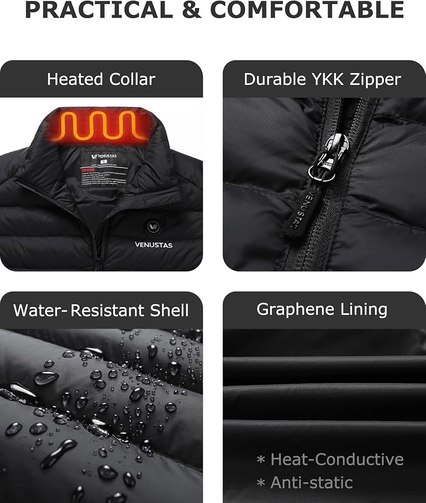 6-Zone Fast Heating System: Designed for cold weather, this Venustas jacket features 6 heating zones (collar, left and right shoulders, left and right-hand pockets, and mid-back) for all-around warmth. The anti-static graphene lining ensures rapid, even heat distribution, keeping your core warm