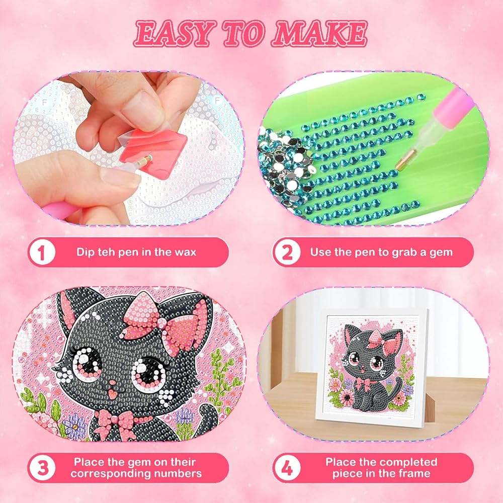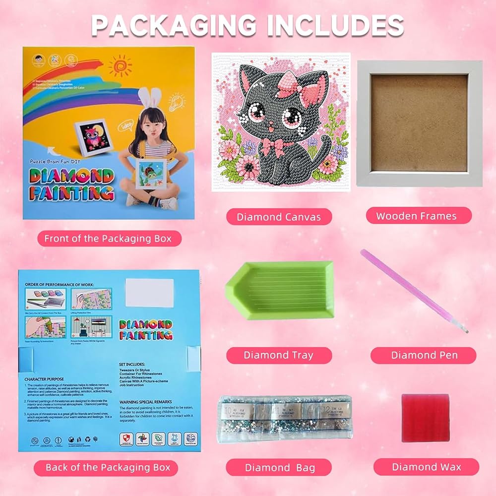 【Diamond Art Painting Kits for Kids】 Gem art kits for kids includes 1 x High-definition printing canvas with printed legend,1 x diamond art painting frame,1 x 5D round diamond drills,1 x diamond applicator pen,1 x jelly glue,1 x tray for holding diamonds and some small bags.