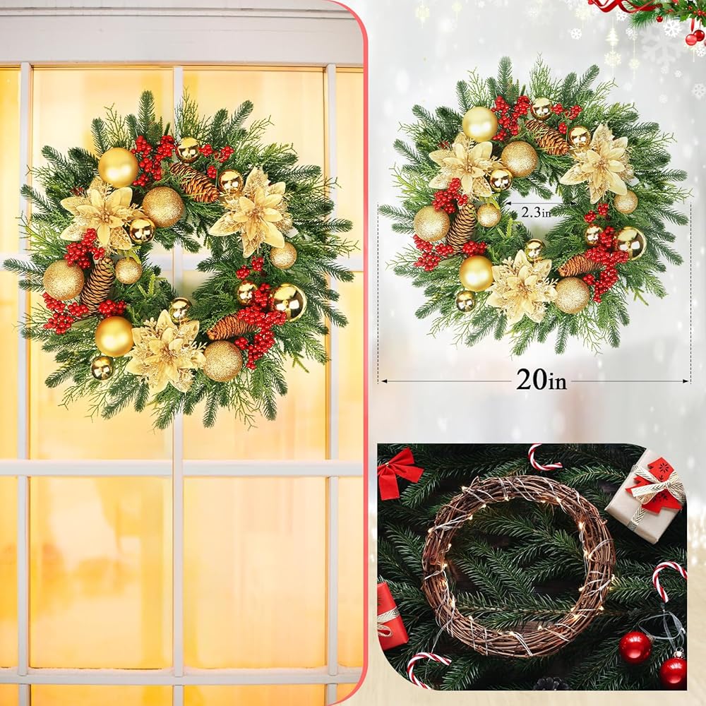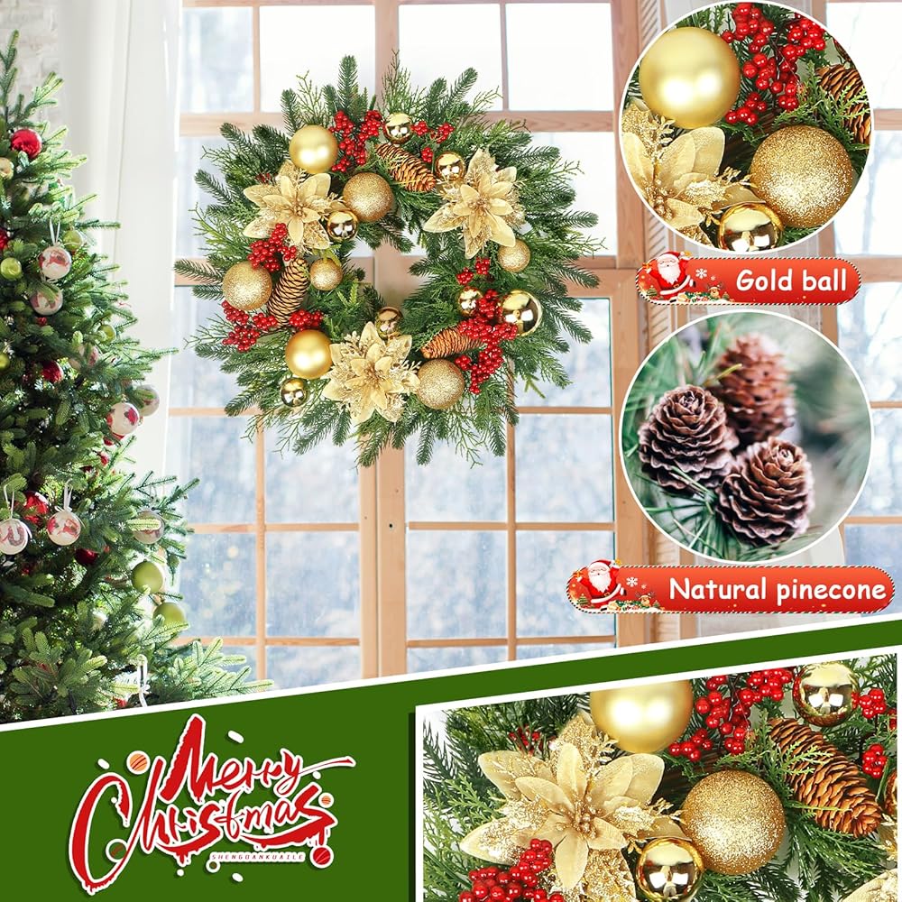 🎉【Christmas Wreaths for Front Door Material】: Front door wreath was made of plastic cypress pine needles berry. The gold flower was made of cloth.The pinecone and back ring vinewas natural. All of product was made of hand-made.