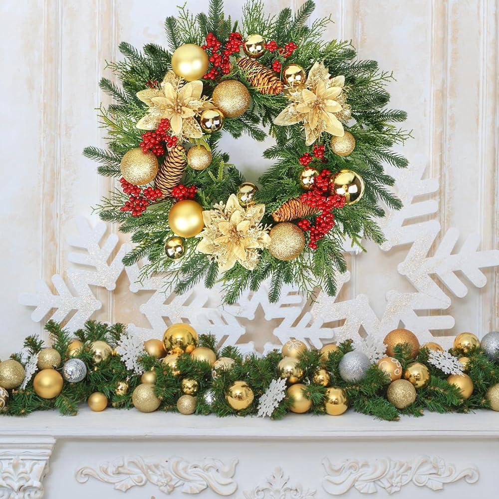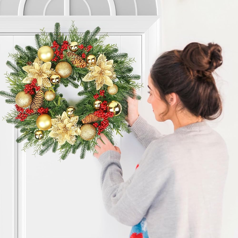🎉【Luxurious Christmas Wreath】The vibrant red berry and Gold Christmas Wreath flowers and glistening Christmas balls with natural pine cones, and cypress pineneedles, on the christmas wreath create an eye-catching contrasting effect for Christmas wreath atmosphere.