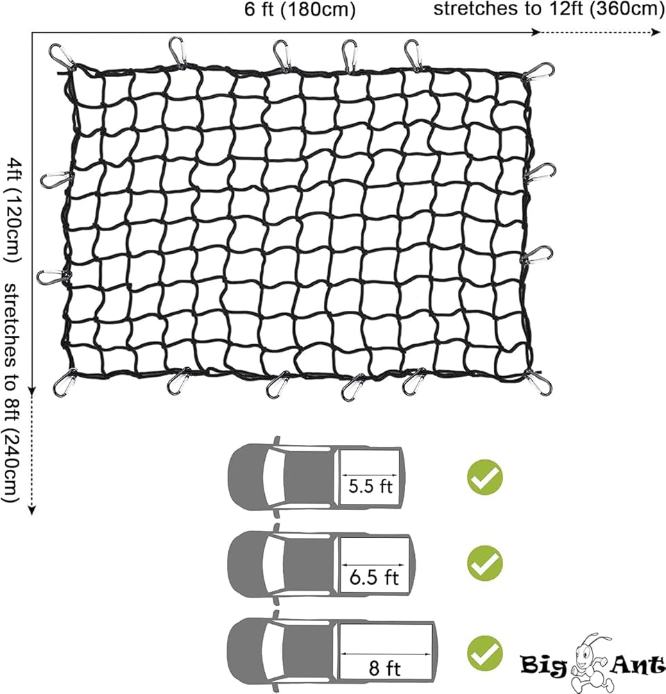 Big Ant Cargo Net 4' x 6' Bungee Cargo Net for Pickup Truck Bed Stretches to 8' x 12' with 18 PCS D Shape Aluminum Carabiners Universal for Pickup Truck SUV Trailer Boat RV