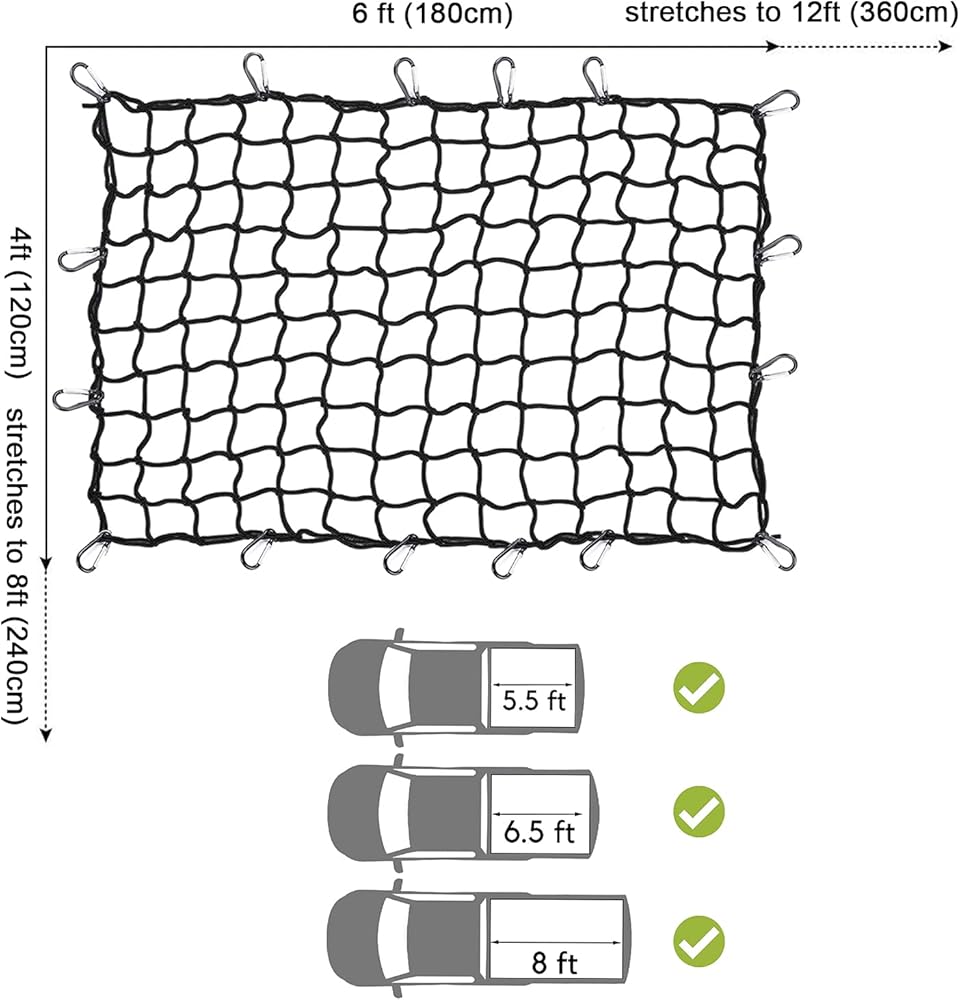 UNIVERSAL TRUCK BED NET - Manufactured with extra thick 5mm latex bungee cord, measures 4'x5' and stretches to 8'x10', cargo net is durable to endure heavy and great for over-sized load coverage.