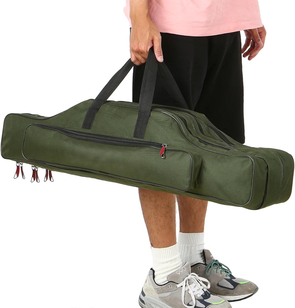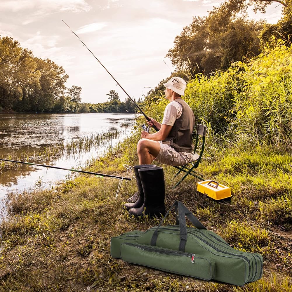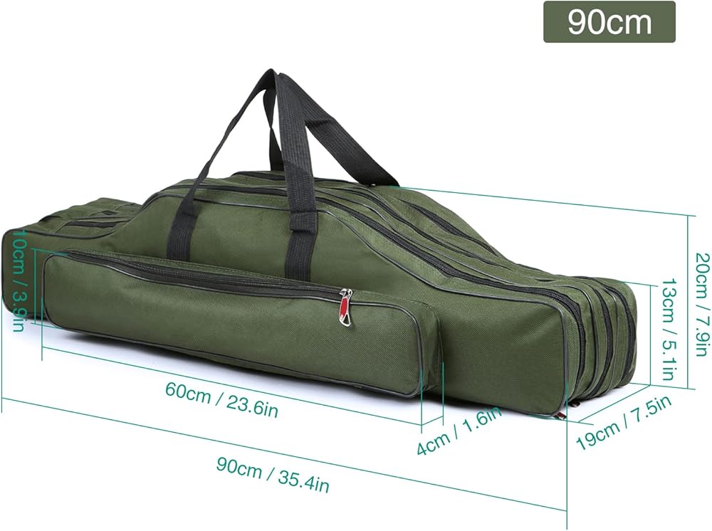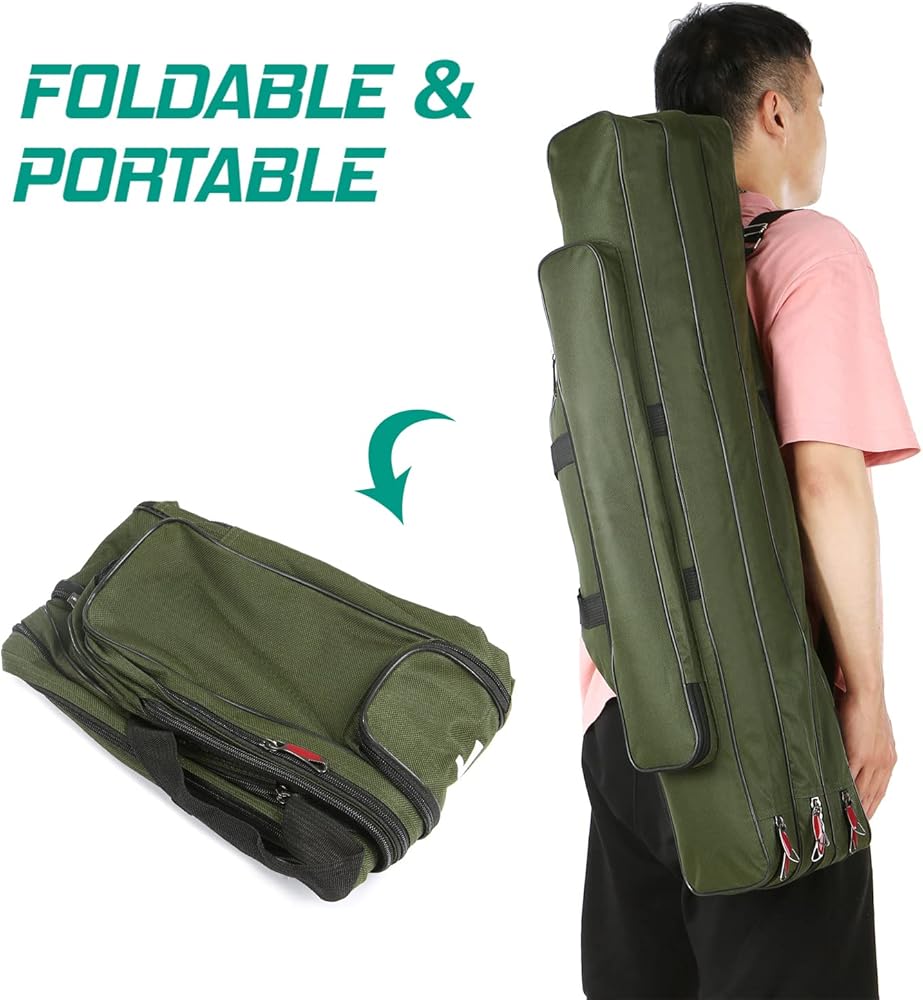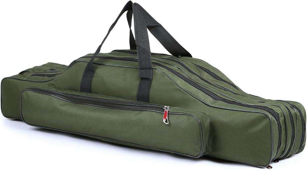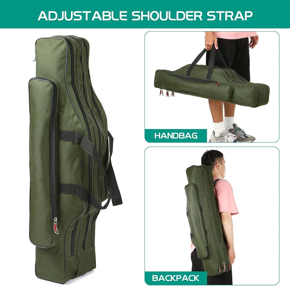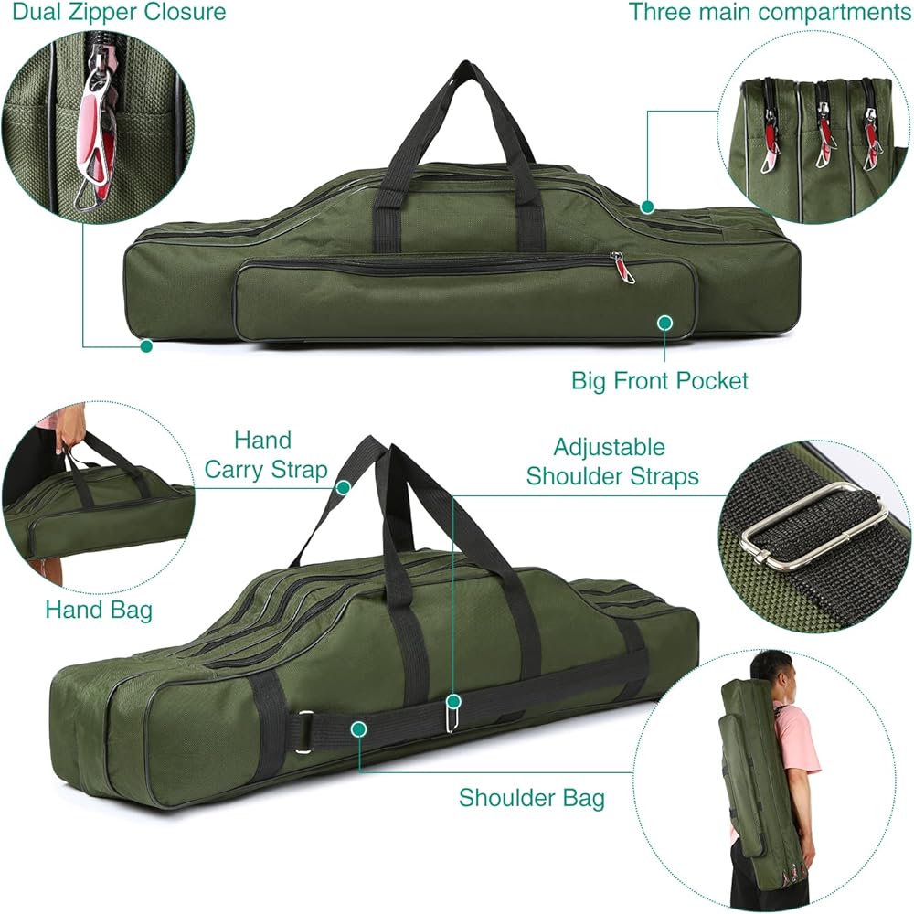 🐬【Easy Access & Organization】 Fishing organizer bag with wide opening and dual zippers, zipper head is made with electroplated metal and closely combined with zipper teeth pulls smoothly, does not east to break, easy access to your essential fishing gear, such as fishing rod, fishing reel, line, tackle box, etc, save your time and effort.