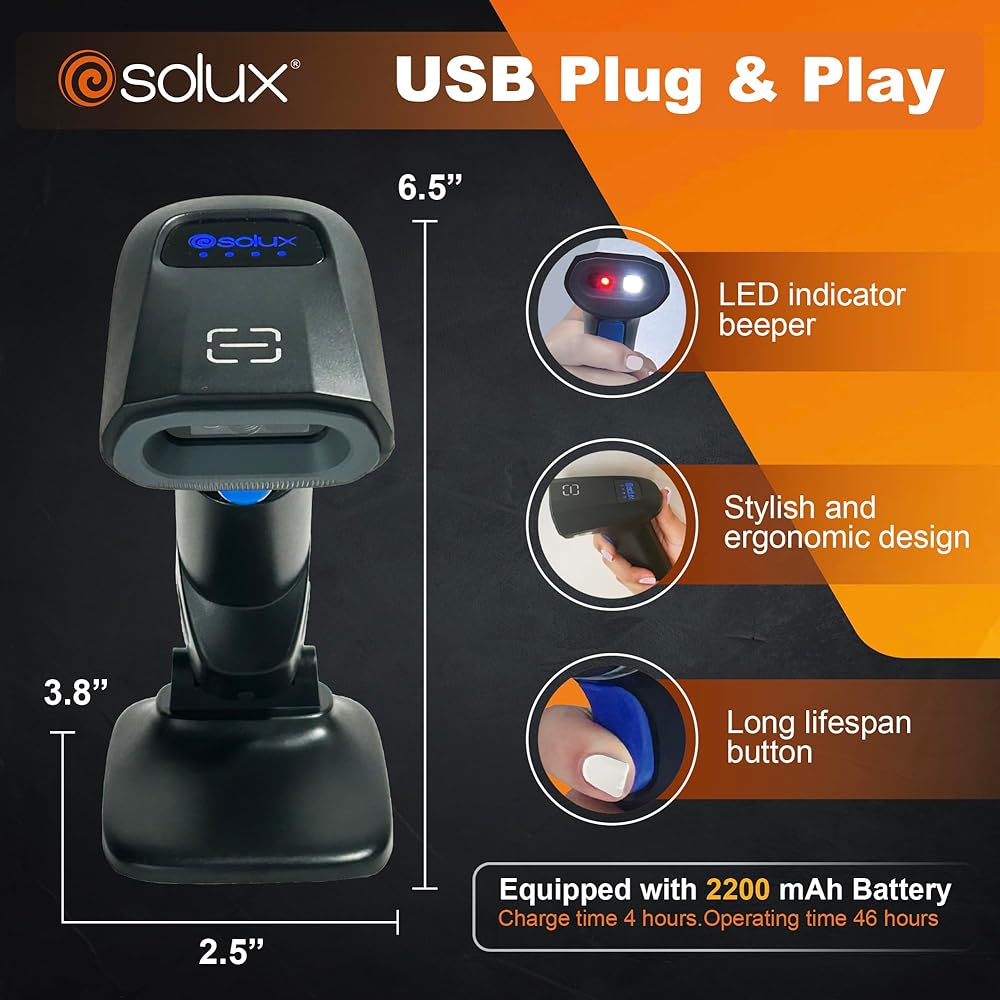 COMPACT, PLUG & PLAY DESIGN: This handheld 2D barcode scanner is perfect for on-the-go use, offering instant setup without drivers. Its larger capacity battery enables longer continuous usage, making it ideal for businesses needing a reliable barcode reader