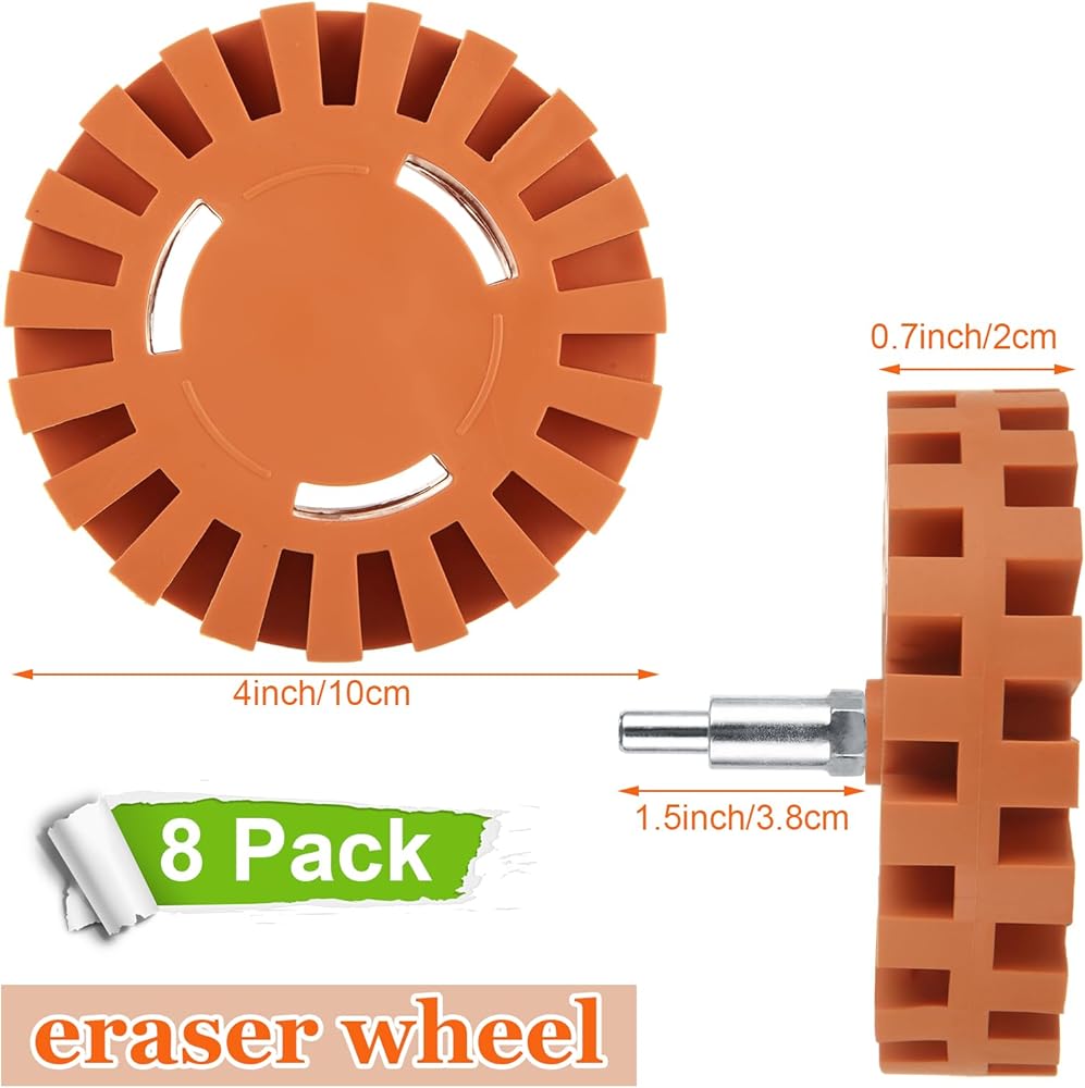 • Easy to Use: The decal eraser wheel kit will fit any home drill, Attach the included drill adapter to your rubber eraser wheel to quickly remove sun-baked vinyl stickers and car wrappings in seconds