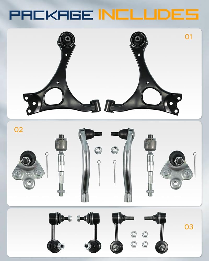 【Package Includes】1x K620383 Front Control Arm and Ball Joint Assembly - Lower Passenger Side, 1x ES800373 Front Outer Tie Rod End, 1x K500069 Front Lower Ball Joint, 1x K80768 Front Sway Bar End Link, 1x K750126 Rear Sway Bar Endlink.