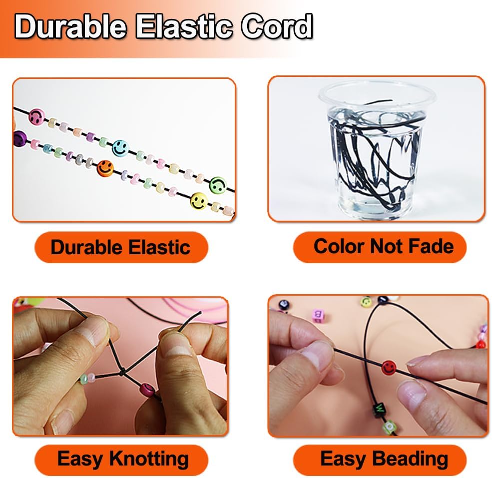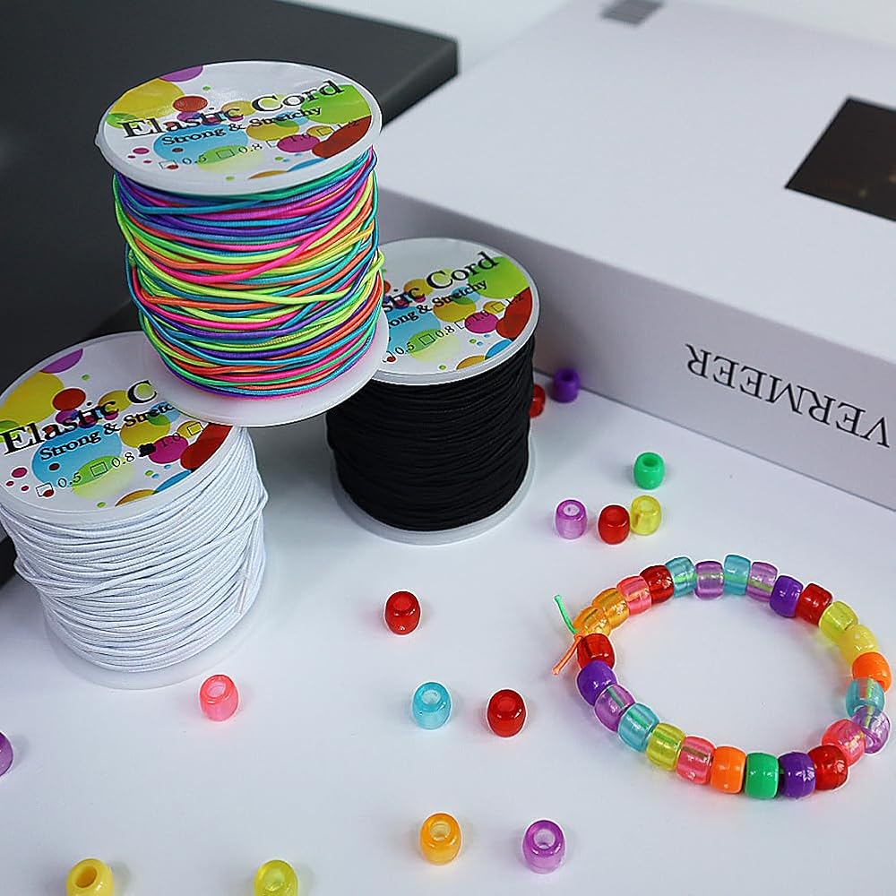 Ewparts Elastic String for Bracelets 1mm Elastic Cord for Bracelet Making Elastic String for Pony Beads Stretchy Beading String for Bracelet 3 Roll Black+Rainbow+White Elastic String for Bracelet