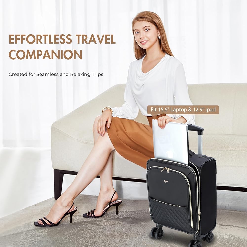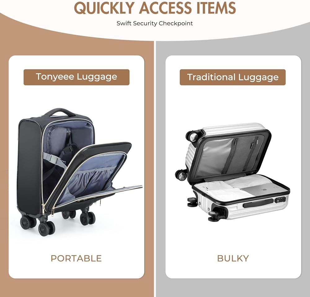 Designed for Quick Access - This carry-on luggage features a quilted exterior pocket for quick access to essentials like boarding passes, magazines, or A4 folders. With a unique accordion-style opening, it makes grabbing items easy without fully opening the suitcase. Also includes a side pocket for a water bottle or umbrella. Multiple carrying options with top and side handles.