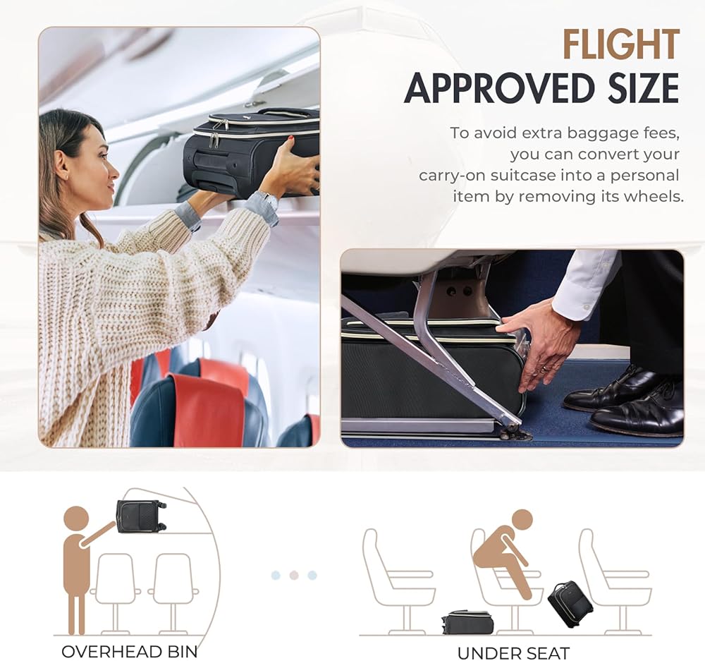 Convertible to Personal Item – This carry-on luggage measures 18.5 × 12.9 × 7 inches, and can be converted to 16.3 × 12.9 × 7 inches by removing the 360° detachable spinner wheels, making it compliant with most airline personal item size restrictions. This allows the luggage to not only fit in the overhead bin but also easily under the seat, providing more flexibility for your travels.