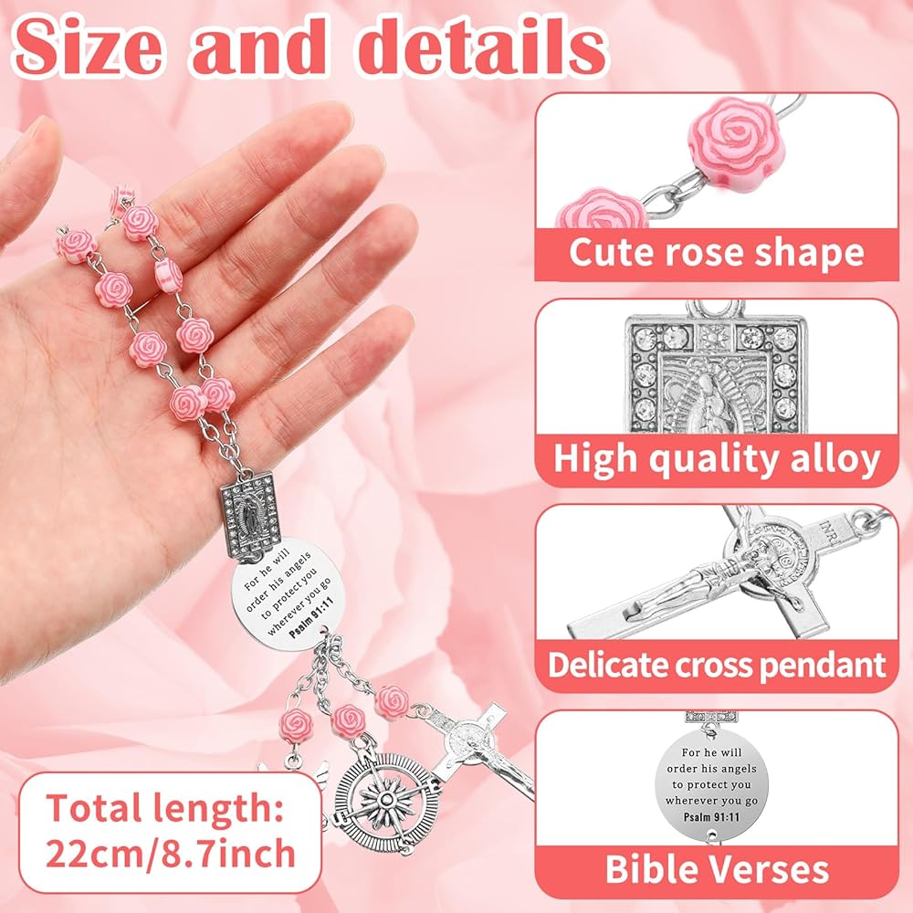 Constructed from quality stainless steel, the scripture pendant of the car rosary is designed for durability and longevity. It comes in stunning colors of pink and silver, offering diversity for personal preference.