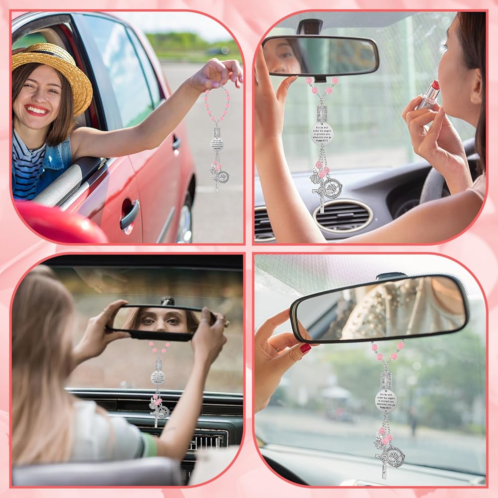 Quelay Car Rosary for Rearview Mirror Cross Car Charm Rosary for Mirror Hanging Psalm 91: 11 Bible Verse Charm Bracelets Religious Gifts New Driver Guardian Angel Gift for Women