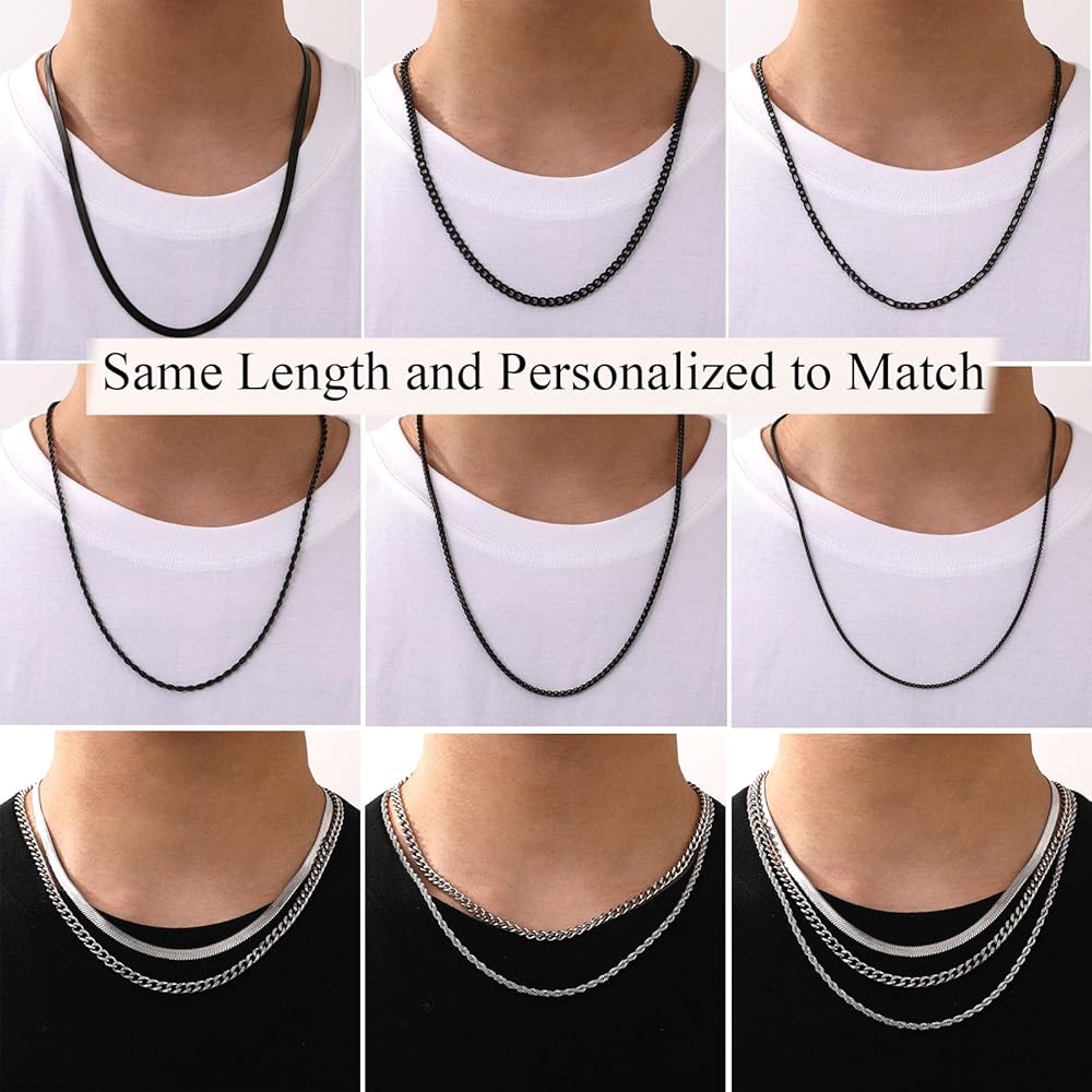【Multiple Combinations】Necklace Type A includes: 5mm Herringbone Chain, 5mm Cuban Link Chain, 4mm Figaro Chain. Necklace Type B includes: 3mm Rope Chain, 3mm Wheat Chain, 2mm Box Chain. Necklaces are available in 5 sizes 16/18/20/22/24 inches. The necklaces are available in silver, black, and gold. You can wear the necklaces with your personalized outfits for everyday or special occasions.