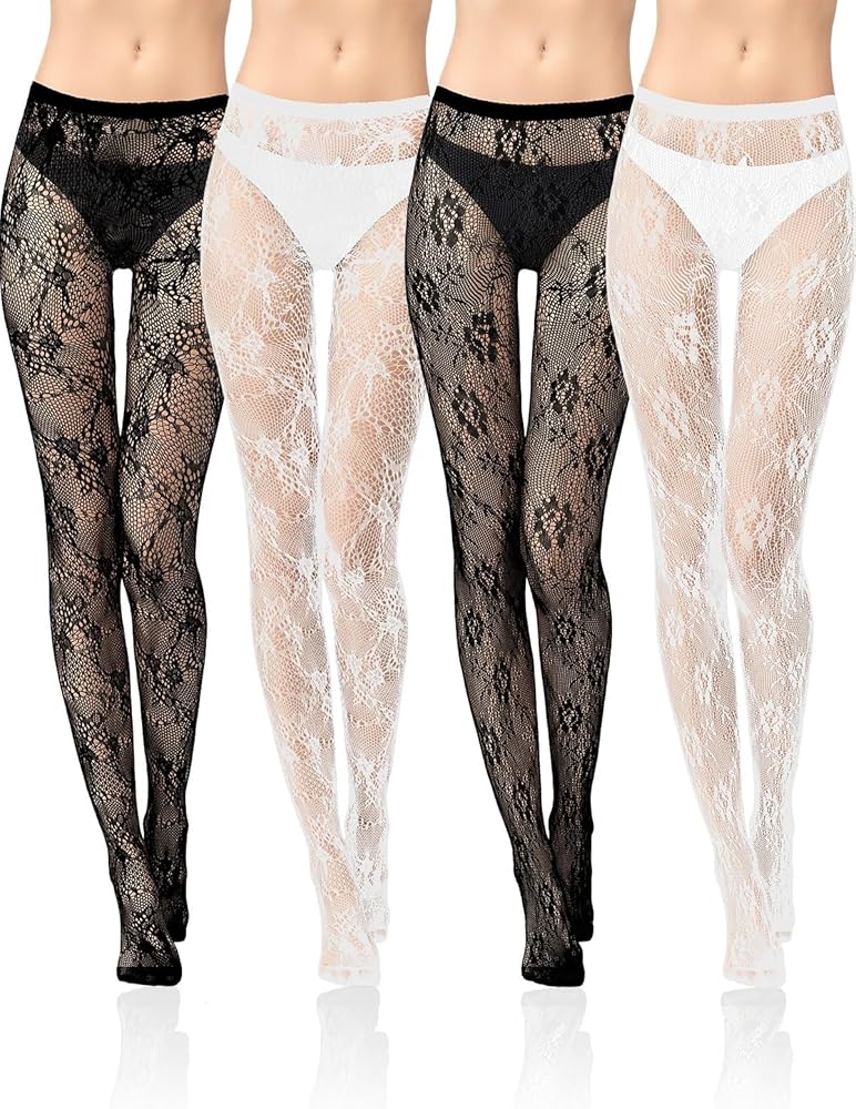 Fashion Fishnet Stockings Set: Package contains 4 pairs of patterned tights, 2 pairs of black and 2 pairs of white, including sunflower patterns and rose patterns. Black stands for mystery, while white stands for innocence. No matter what style, you can boldly try to make yourself more radiant, confident and beautiful, each pair of lace tights is carefully designed and matched with different styles, can easily cope with various occasions and show your unique charm