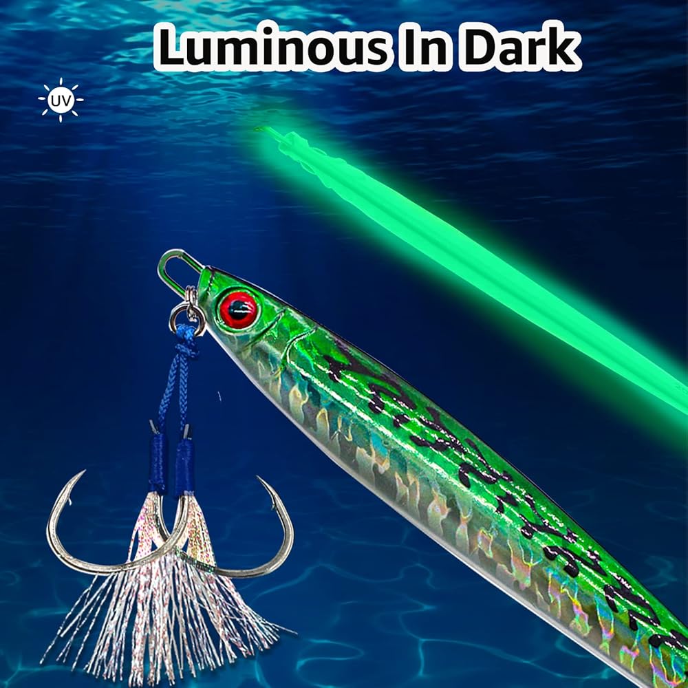 [Laser Coating & Luminous Jigging Lure] The jigging lure is coated by laser paper, which can refract light from all angles underwater. Besides, it has luminous effect at night. The target fish can locate the fishing bait easily, whether during the day or night.