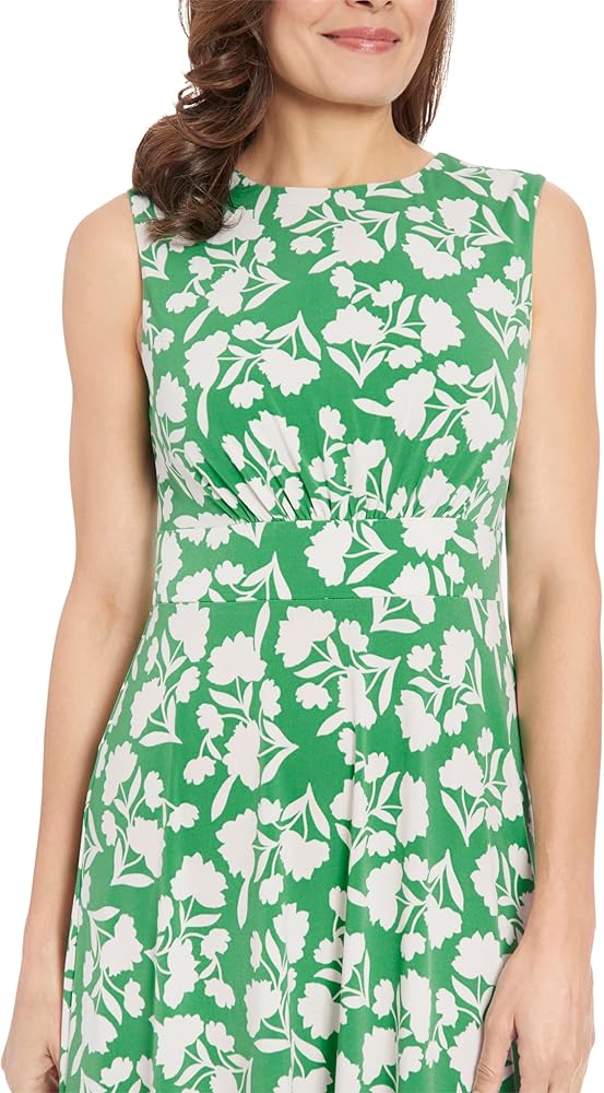 Sleeveless floral dress featuring a jewel neck, shirring under bust at top of waistband, and a below-the-knee length skirt. This pretty garden dress has an A-line silhouette perfect for a beach or vacation look.