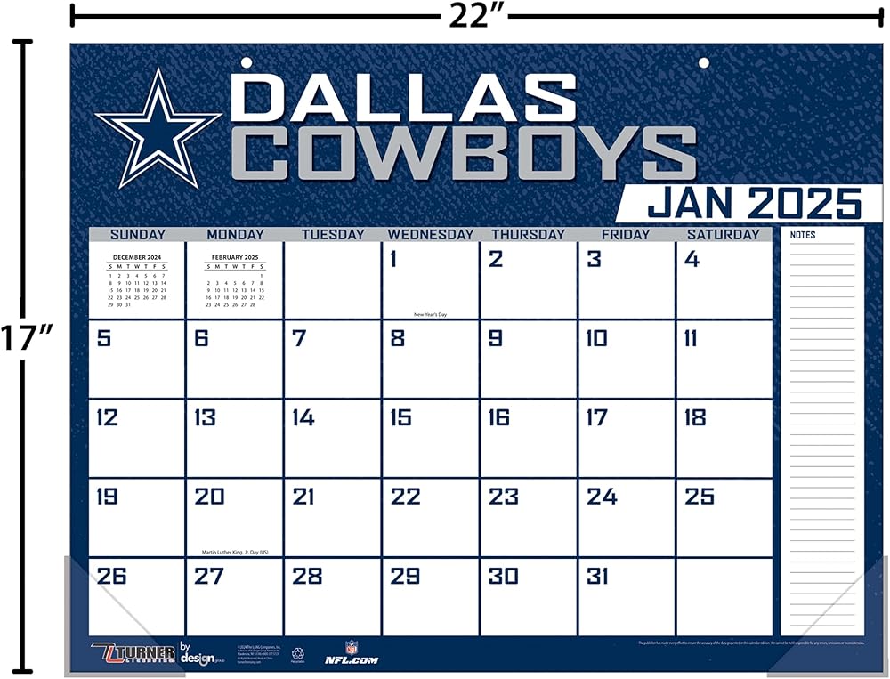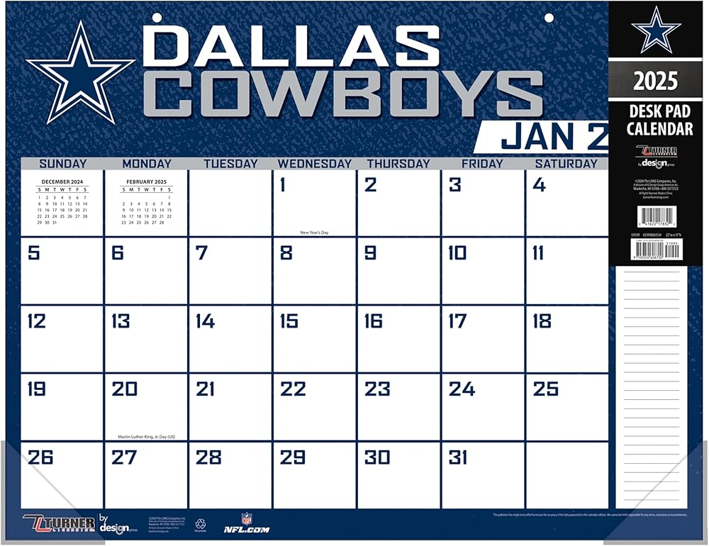 This large-scale calendar is perfect for any desk. With ample space for notes and appointments, Turner Desk Pad Calendars will help keep you on schedule, while proudly supporting your favorite team! 12- Month Format (January - December 2024) Dimensions: 22"w x 17"h