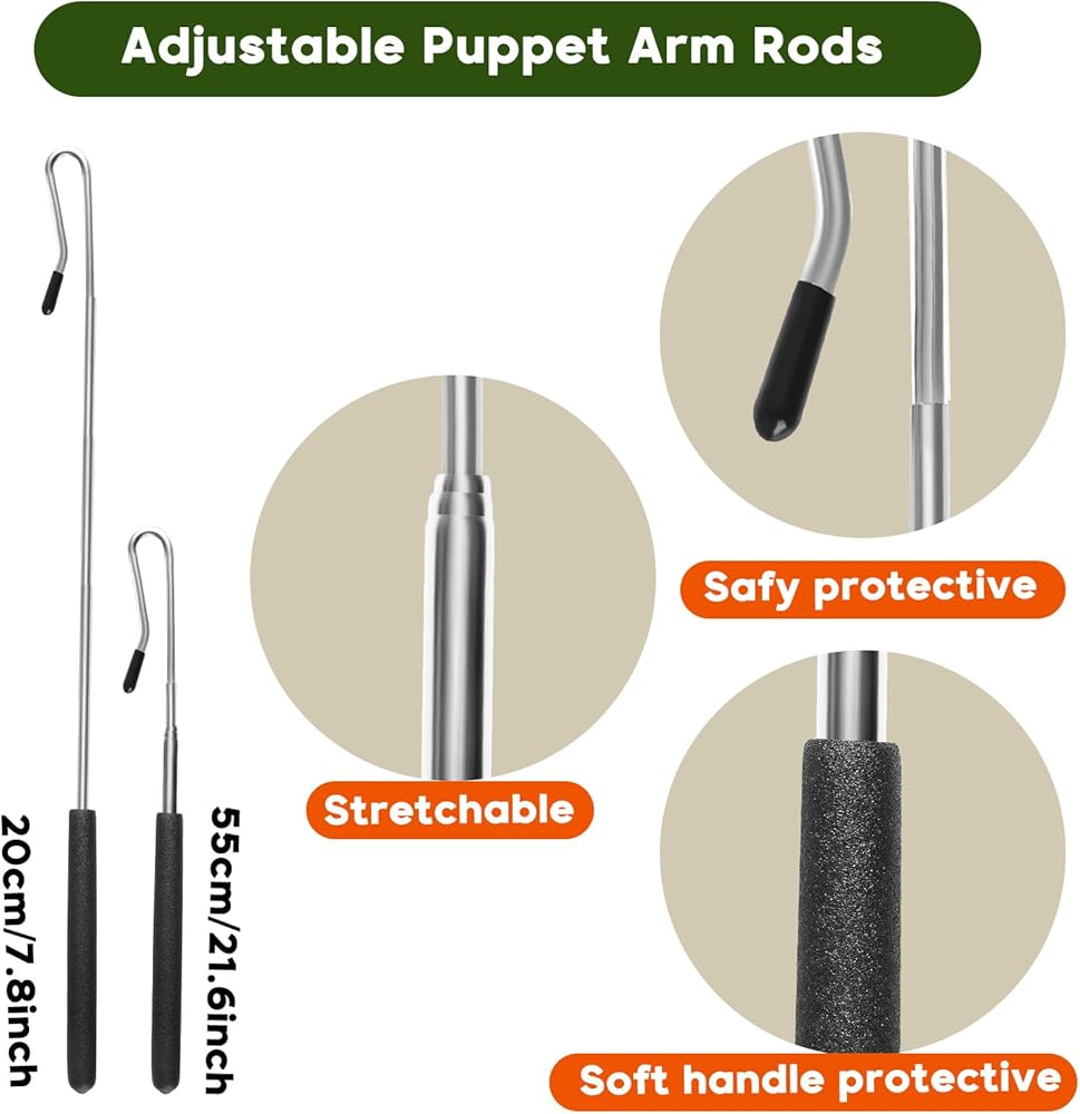 Heavy Duty Puppet Sticks: crafted from quality stainless steel, these adjustable arm rods have a smooth surface with a safety cover on top, ensuring a secure play environment for kids