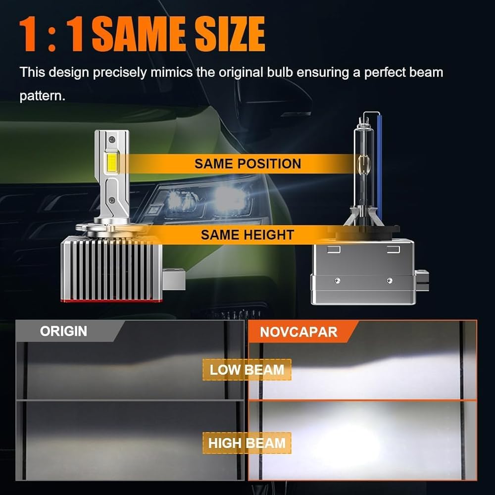 【Effortless Installation, Seamless Fit】 Don't let bulb replacement be a hassle! Our NOVCAPAR D3S LED Light Bulbs are meticulously designed to be a perfect fit with a 1:1 design compared to original HID bulbs. With NOVCAPAR D3S LED Bulbs, there are no extra wires or external drivers needed. They are directly compatible with your original HID ballast, perfectly replacing D3S, D3R, and D3C OEM xenon bulbs without the need to change any wiring.