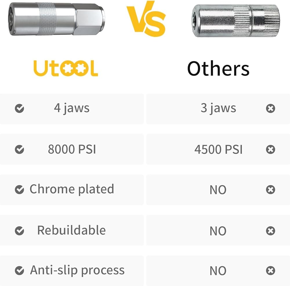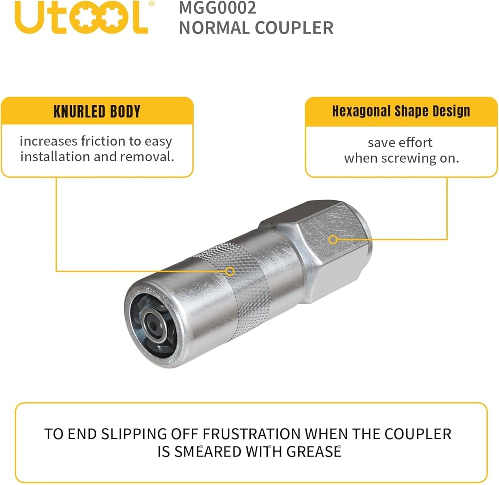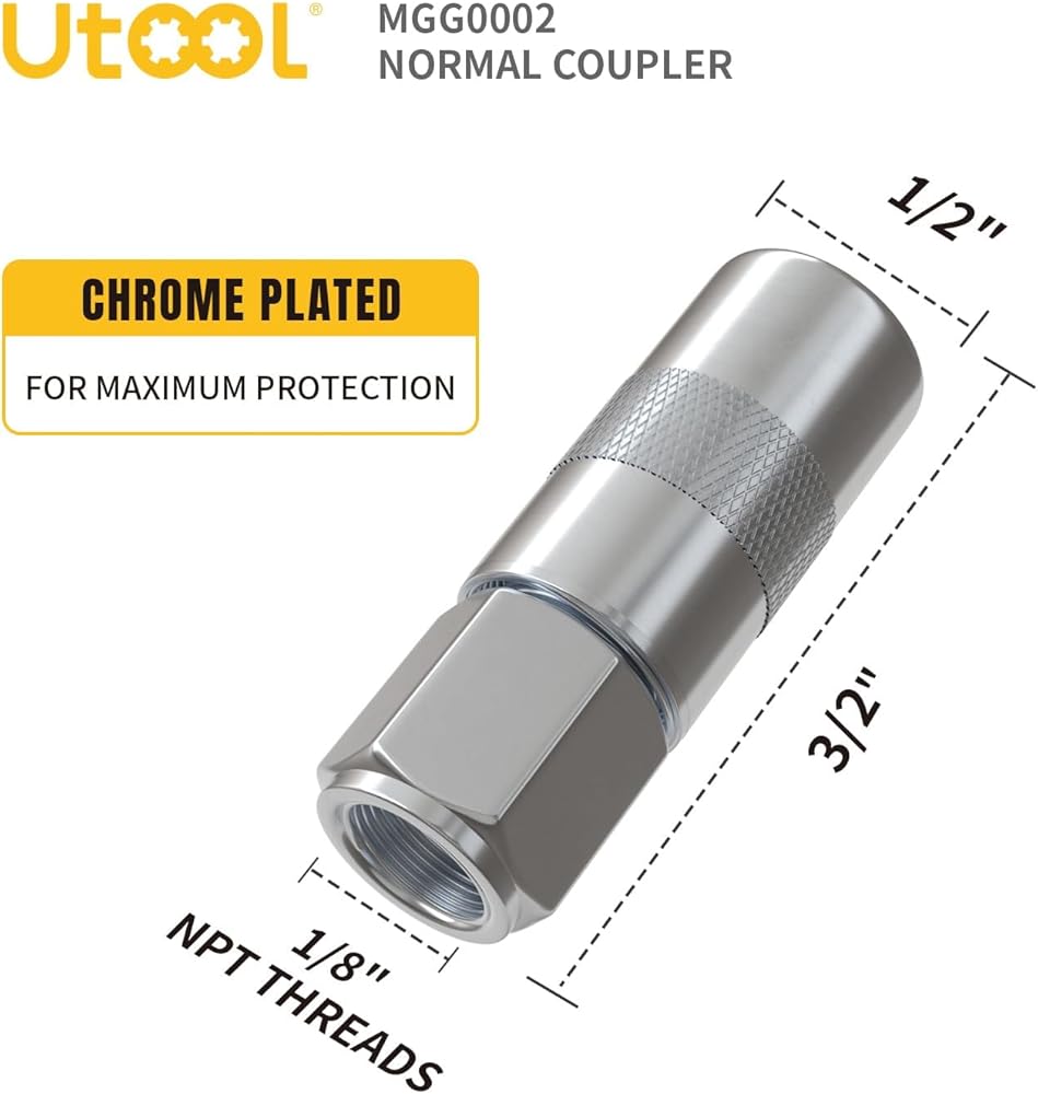 - 🔩【Grease Gun Coupler】UTOOL Grease Gun Coupler has 1/8“ NPT female thread and is rated to 8,000 PSI.