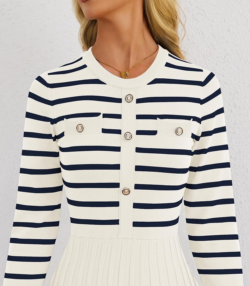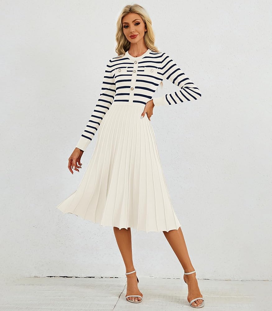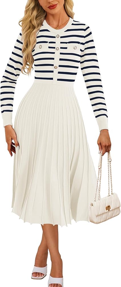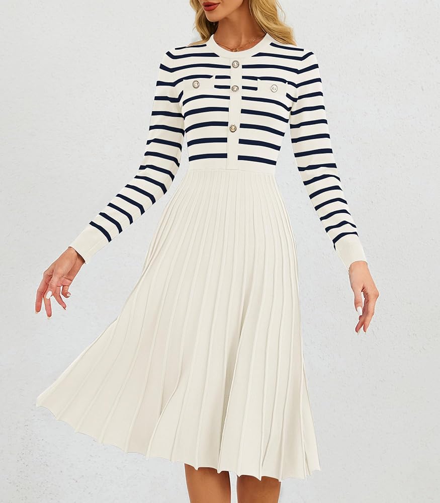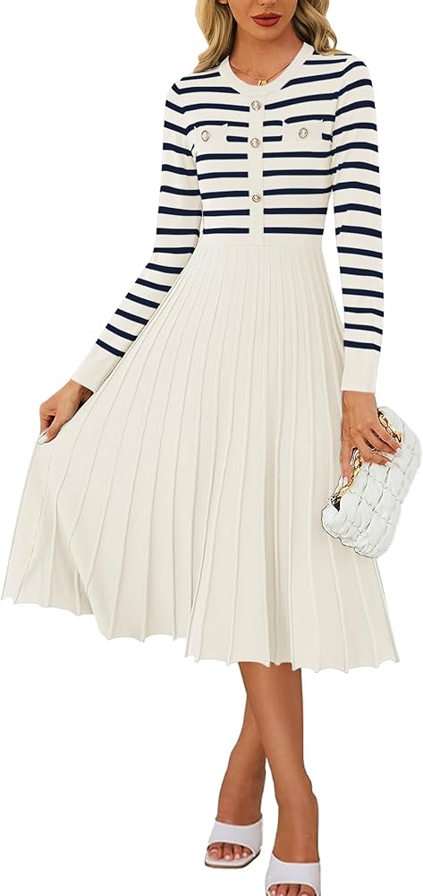 【Design】The pleated A-line dress features a crewneck,long sleeves and chic button decoration,giving it an elegant and stylish look.Additionally, the dress has two side pockets for carrying small items, and the stretchy and elastic waistline accentuates your figure.perfect for your casual wear.