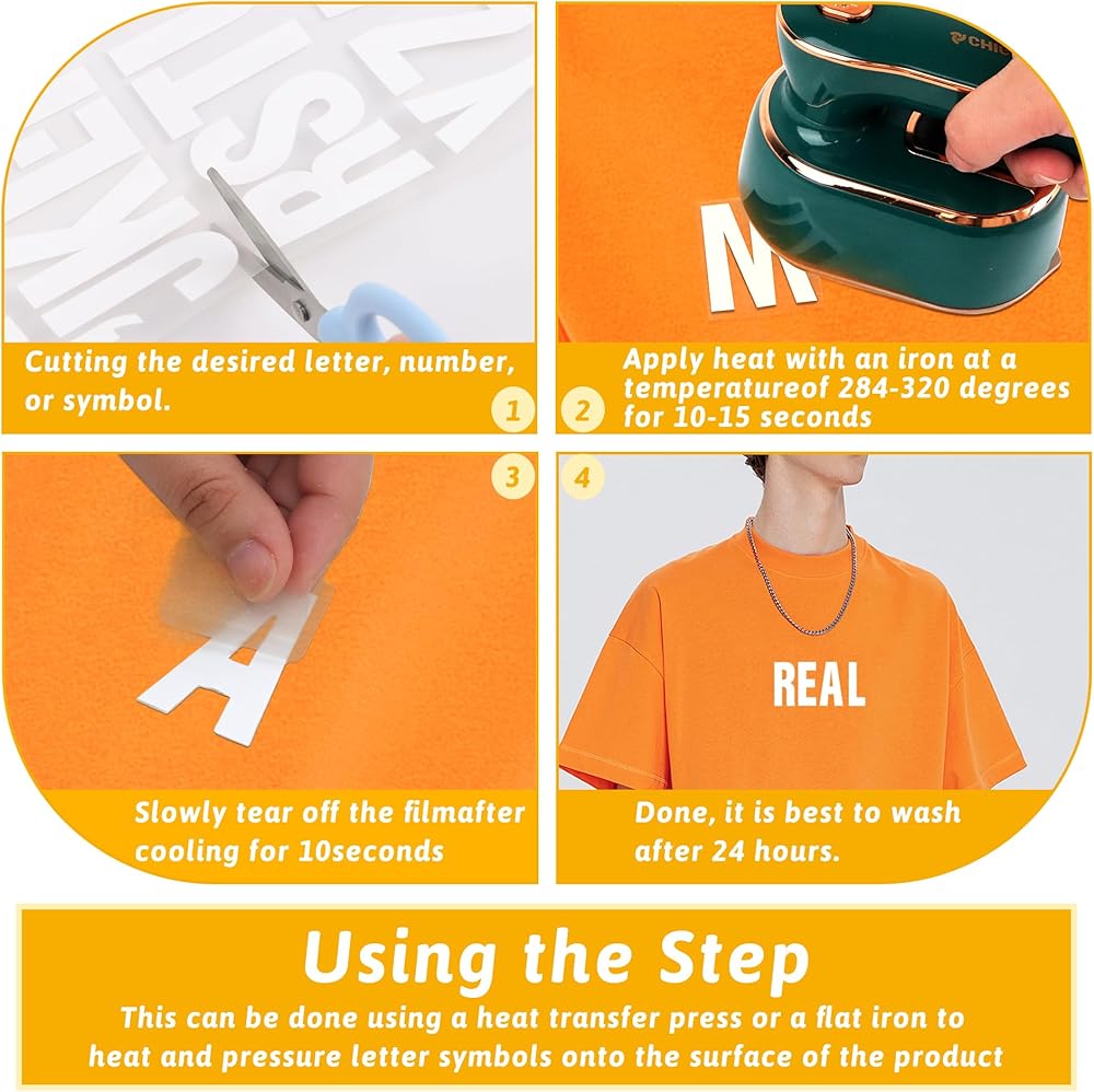 Easy to Operate,Take Seconds to Tranfer : Apply these stickers is breeze,suitable for both beginners and skilled people. Firstly choose the letters and put them on clothes or fabric,then use a heat transfer machine or iron at the temperature of 284-320 degrees Fahrenheit to press for about 10-15 seconds. Just wait until the letters have cooled down, remove the protective film to complete the printing process and get a fabulous art finish for your clothes