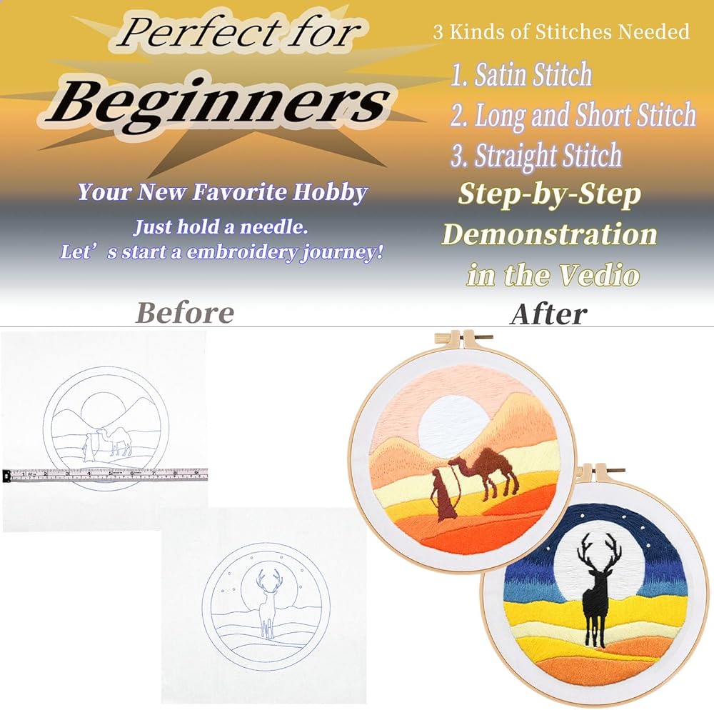 【Contains】Each kit contains 6-strand carded floss, needles, 2 pre-marked canvas fabrics, a 8'' hoop and instructions.