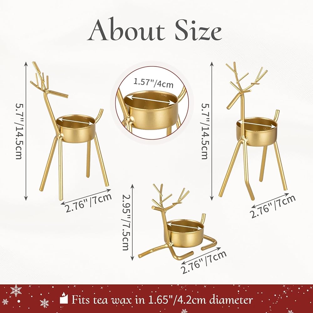 Size: Each rustic reindeer votive features a candle cup on its back, suitable for tea wax in 1.57" diameter and 0.63" tall. Height of the Reindeer is 5.7"/5.7"/2.95", spacing of front and back legs is 2.76"/2.76"/3.15". The size is so cute and you can palce them together or scatter them around your house for a charming Christmas touch!