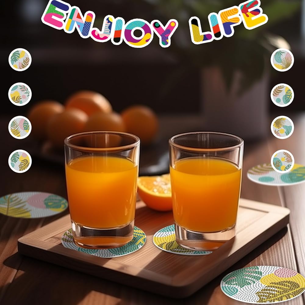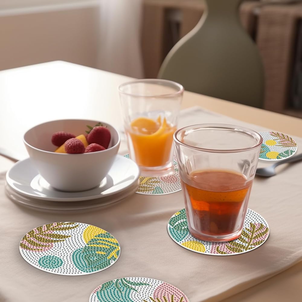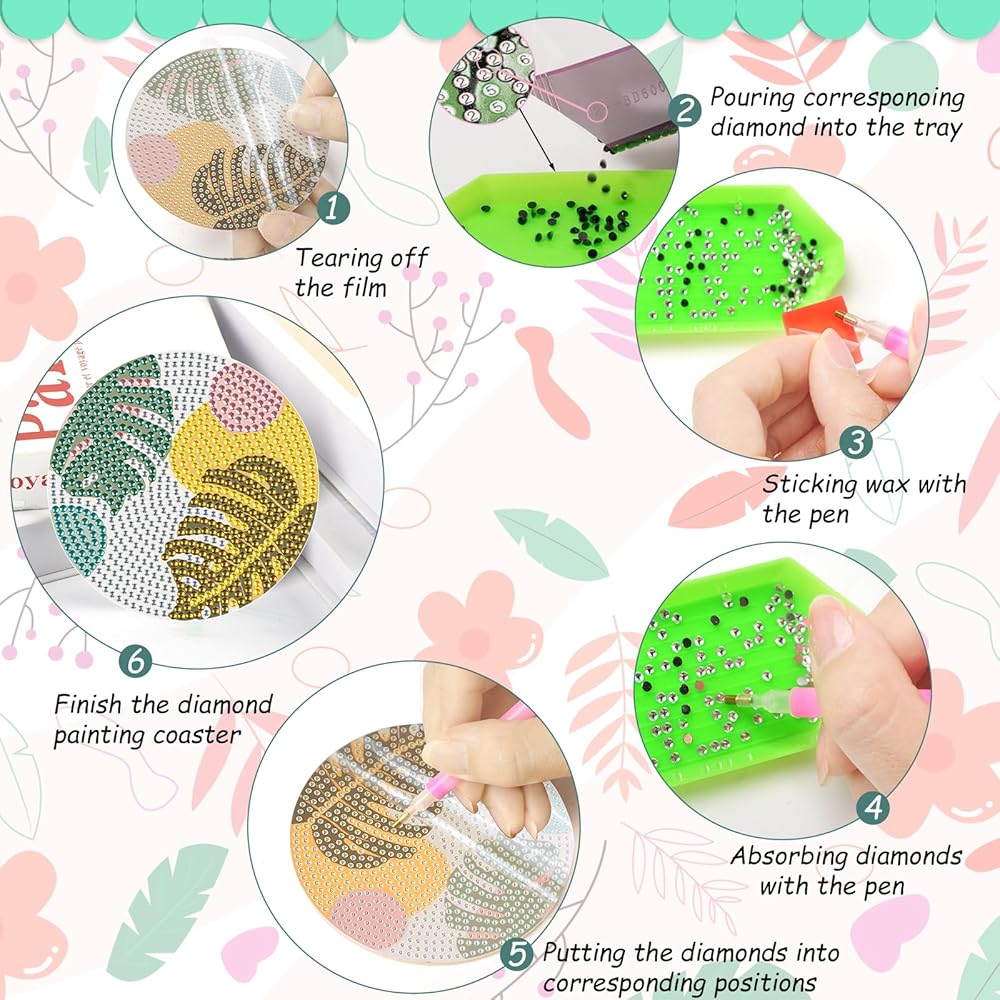 Easy to Operate:Our diamond coasters are clearly marked with a number, pour your the diamonds that corresponds to the number on the coaster into the tray, and stick the corresponding diamonds on the coaster according to the number on the coaster, finally, glue the cork pad to the back of the coaster,a unique and beautiful coaster is done.