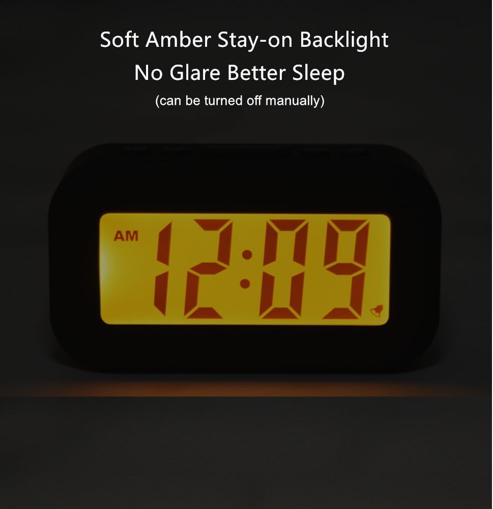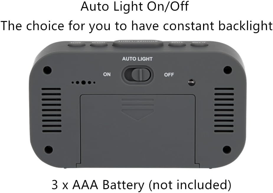 【AUTO BACKLIGHT ON/OFF】Turn the auto light on,the clock screen will be backlighted constantly and softly in less lighting condition to ensure you can see the time clearly day and night,especially convenient for you to glance at the time in dark.The backlight is amber/orange color without glare so that it won't disturb your sleep while the time can be easily seen at night.Turn the auto light off,you can press top snooze/light button to light up the screen for only 5 seconds