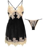 Lilosy Sexy Silk Lace Up Backless Satin Applique Floral Lace Babydoll Lingerie Dress with Tong 2 Piece
