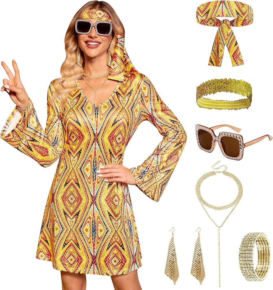 Embrace your inner flower child and unleash your funky side with this 70s-inspired costume, a must-have for any woman wanting to channel retro vibes this Halloween.