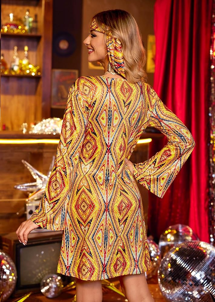All eyes will be on you as you dazzle in this unique and eye-catching dress, filled with sequins and retro charm for the ultimate disco queen look.