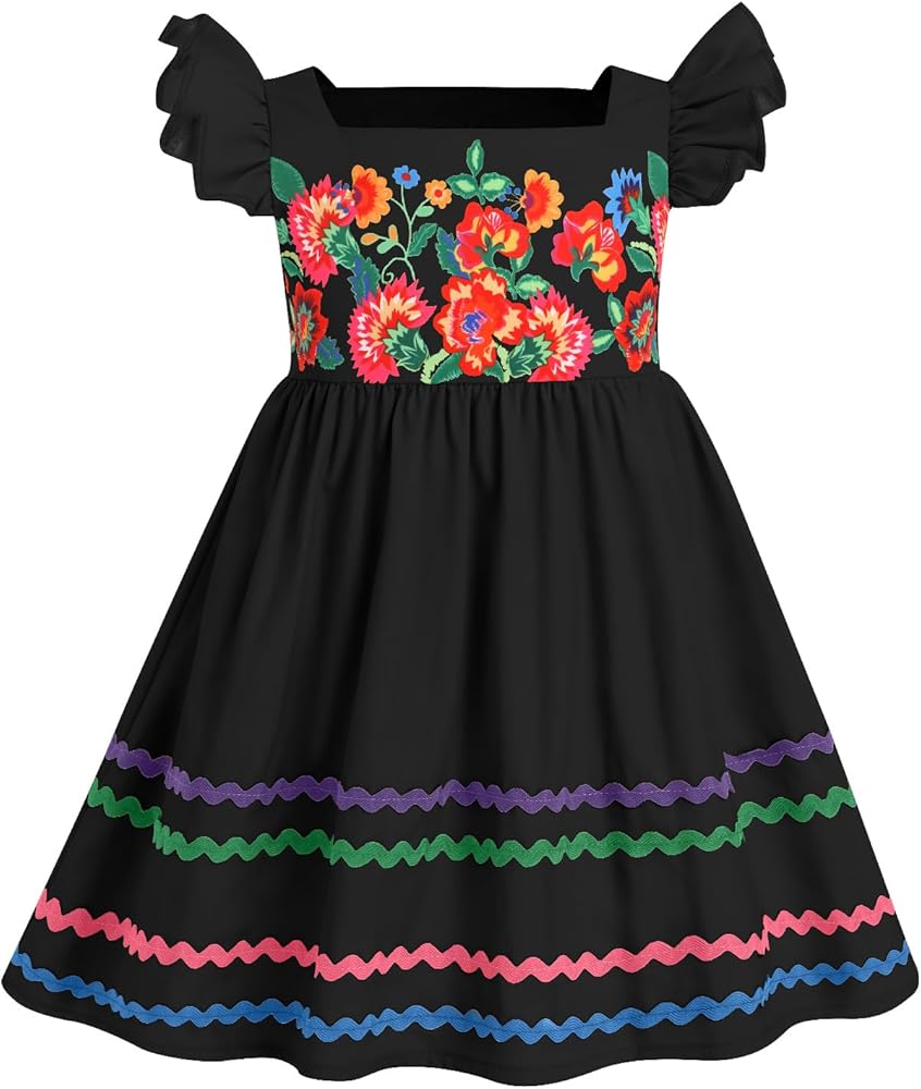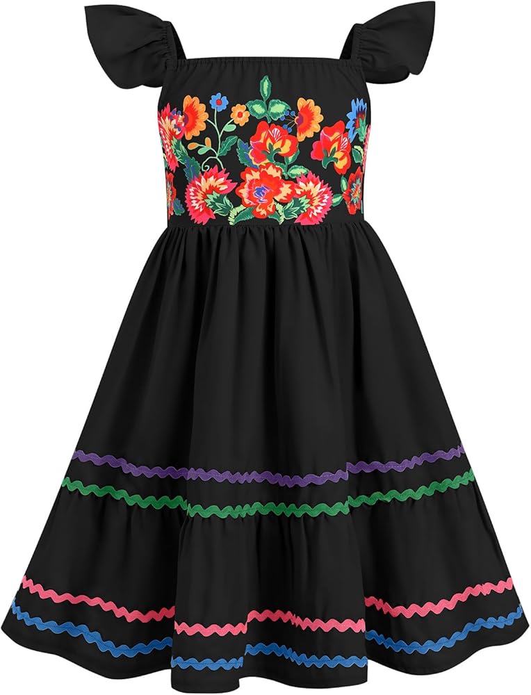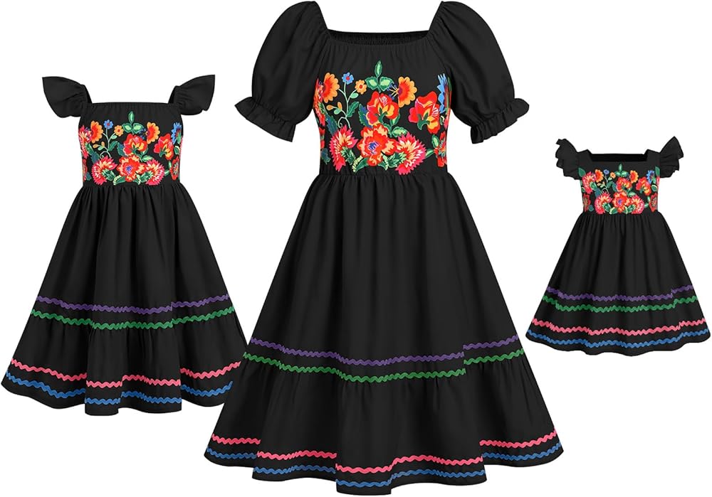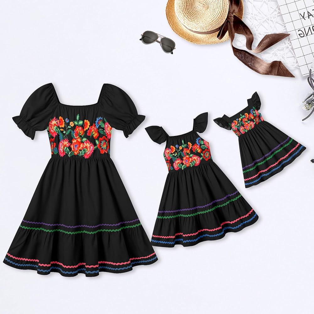 DESIGNED: Mommy and me Flutter Sleeve Floral Print Ruffle Hemline Mexican dresses matching set, very pretty matching dresses for mother and daughters, This is a flutter sleeve square neck floral Summer Mexican Cinco De Mayo Fiesta black hot red mexican mommy and me dresses, Flutter Sleeve, Square Neck, Smocked Back, Floral Print, Rickrack Trim, A-line Mexican Cinco de Mayo patterns Dress, mexican embroidered mother daughter dresses matching set, hot red mexican mother daughter matching outfits