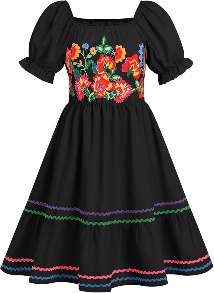 FEATURES STYLE:Mom and daughter matching outfits, Boho Floral Print mexican cinco de mayo fiesta Beach Party flower Print dress for mommy and me, backless with elastic smocked back, Blue and red flowers at front, Multi-colored rickrack trim, you will get lots of compliments with full of an mexican ethnic feelings traditional mexican mommy and me matching dresses, flower Print ruffle traditional mexican style flutter sleeve Round Neck Ruffle Drape mexican fiesta dress for women and girls,