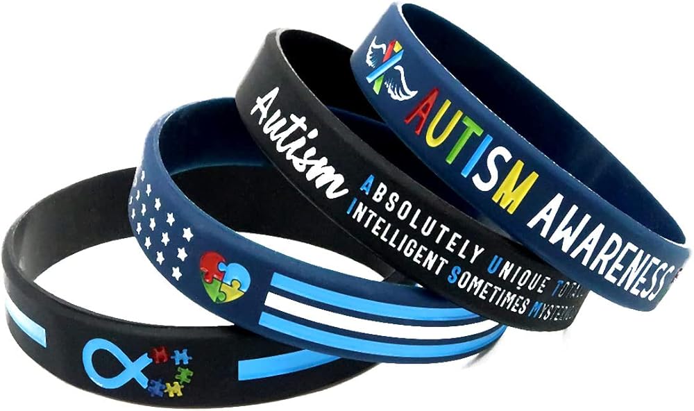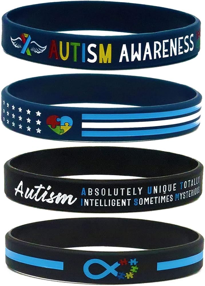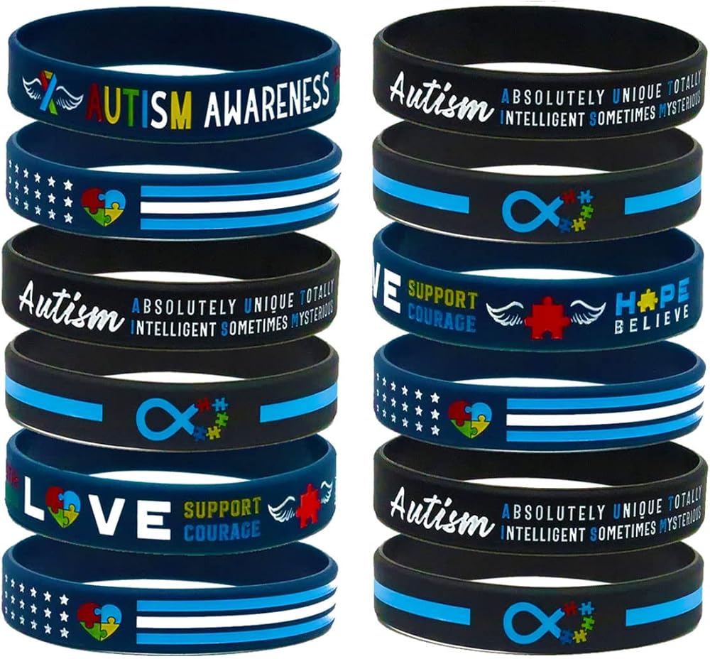 CONTENTS: 12 silicone rubber bracelets / 4 unique designs / 3 pieces per design. SIZE: 8 inches circumference with slight elasticity. Tarnish resistant and noiseless, snag-flee wristbands. This assortment of unisex Autism Awareness bands will enhance any Autism event. Use them as favors for goodie bags, or as Autism products for fundrasing merchandise. This pack includes 4 dazzling designs: Autism infinity symbol, United Hearts of Autism Flag, Autism Acronym and Words of Autism Awareness and Support. Soft to the touch and comfortable to wear, these eye-catching bracelets are popular as sensory toys and fidget jewelry.