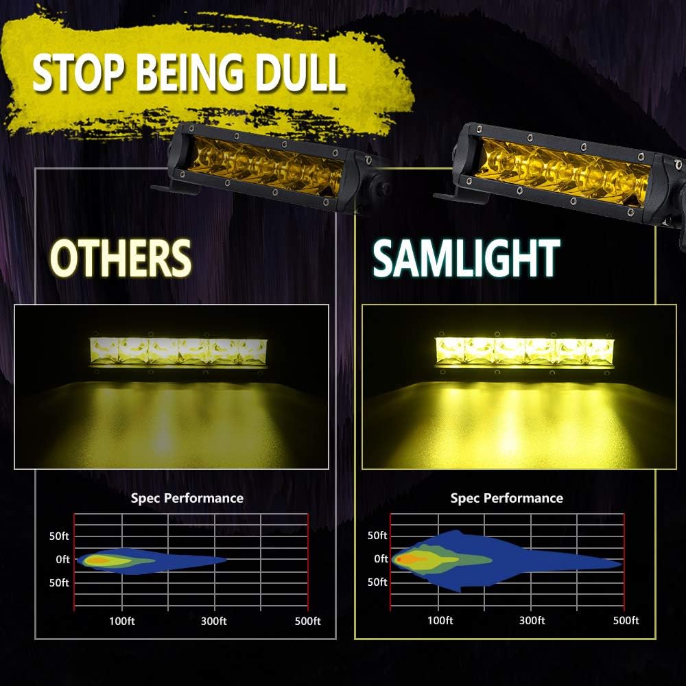 ▶ RUGGED CONSTRUCTION. Samlight Yellow LED Light Bars are built tough for use on the roughest terrain. Featuring an extruded aluminum housing with a clear, shatterproof polycarbonate lens, this yellow fog light bar has a waterproof rating of IP 67, making it ideal for use in wet environments. The housing is completed in a textured black powder coat finish for aggressive good looks and long lasting corrosion resistance.