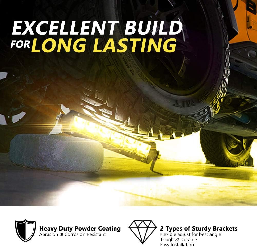 ▶ IDEAL FOR NIGHT RUNS. Extra auxiliary light bars are a must have upgrade for any Jeep owner that finds themselves off road after dark. Featuring a spot beam pattern in one durable housing, this 7 inch Super Slim Single Row LED Spot Yellow Light Bar is perfect for camping and late night off-roading.