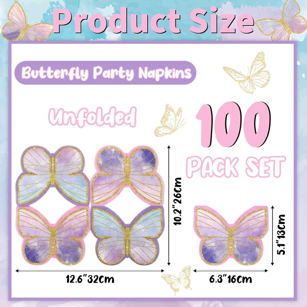 Package & Size - You will get 100 pcs butterfly party napkins, these butterfly party decorations measure about 6.5x6.5inch / 16.5x16.5cm. (Unfolded size 13x13inch / 33x33cm).