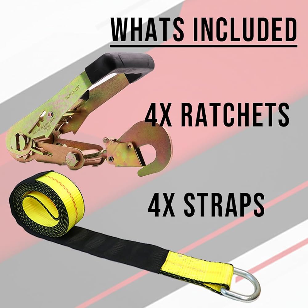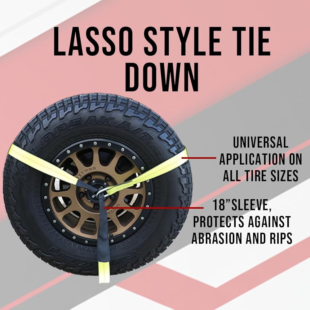 [SPECIFICATIONS] 4 Pieces Lasso-Style Car Tie Down; Includes 4x Lasso Straps with O-Ring & Strap Protector. 4x black double-locking ratchet buckle short-end with Snap hook on one end. 2 inch by 96 inch polyester straps that are yellow with a custom black edge finish.