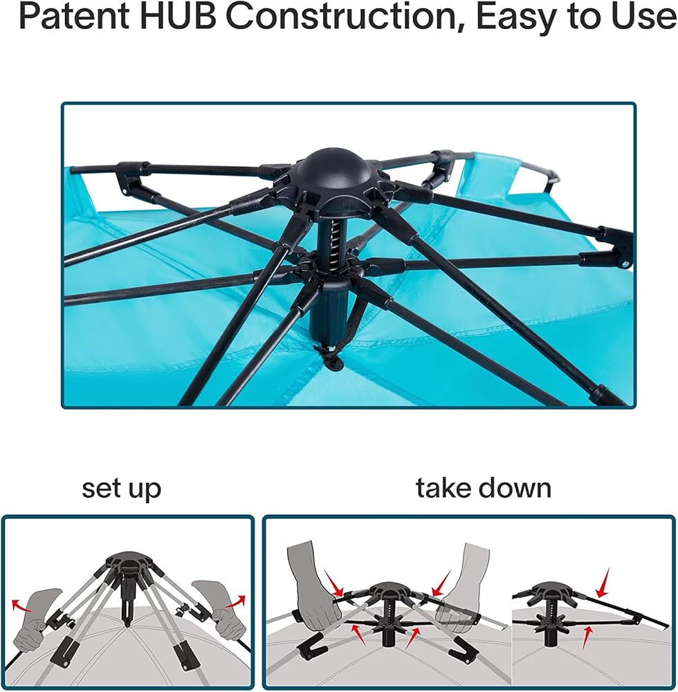 ☀ خيمة الشاطئ ذات الظل الشمسي المفتوحة تلقائيًا الحاصلة على براءة اختراع في السوق: نظام ميكانيكي HUB في الأعلى في انتظار الحصول على براءة اختراع، مما يجعل الخيمة مفتوحة بمفردها دون مجهود. إطار متين ومتين من الألياف الزجاجية يدعم الخيمة دون القلق من الانهيار.
