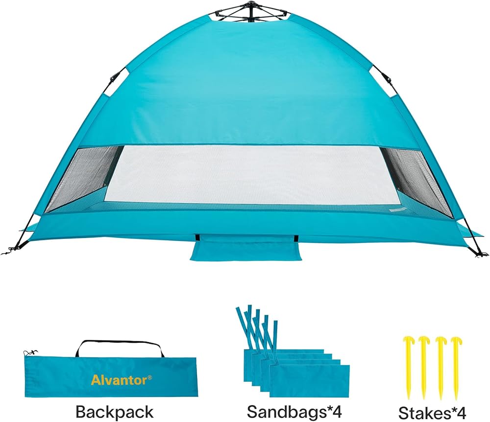 ☀ تصميم مبتكر: حماية من الأشعة فوق البنفسجية بعامل حماية من الأشعة فوق البنفسجية 50+ ونسيج مقاوم للماء للجدران والأرضيات. شبكة من 3 جوانب توفر تهوية ممتازة. 3 جيوب رملية و4 أكياس رمل إضافية مربوطة بخيوط، بالإضافة إلى 4 أوتاد. هذا المأوى الشمسي المنبثق على الشاطئ مقاوم للرياح حتى 25 ميلاً في الساعة.