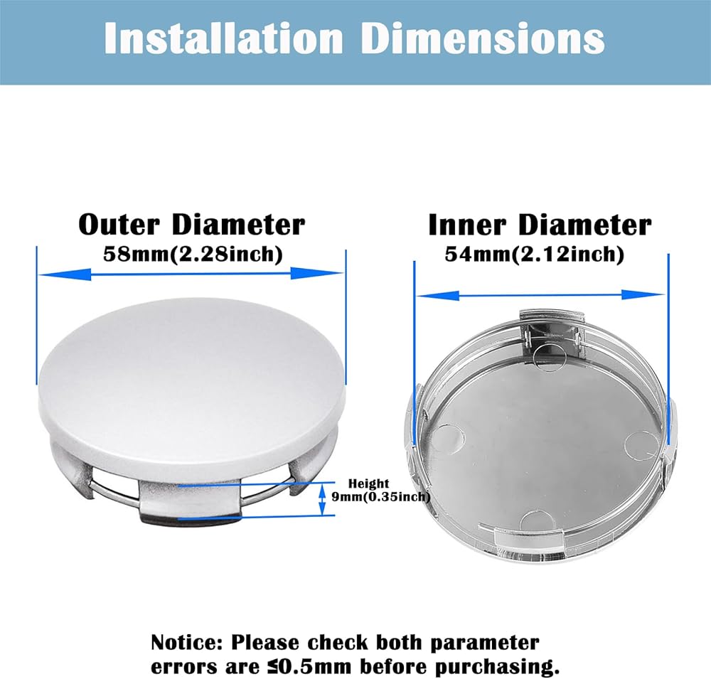 Universal Car Accessories: Wheel center caps cover for outer appearance hub bore 58mm 2.28" suitable range(57.5mm-58.5mm), assemble hub bore inner 54mm 2.12" suitable range (53.5mm-54.5mm), Length 15mm 0.59", Height of clip 9mm 0.35inch.