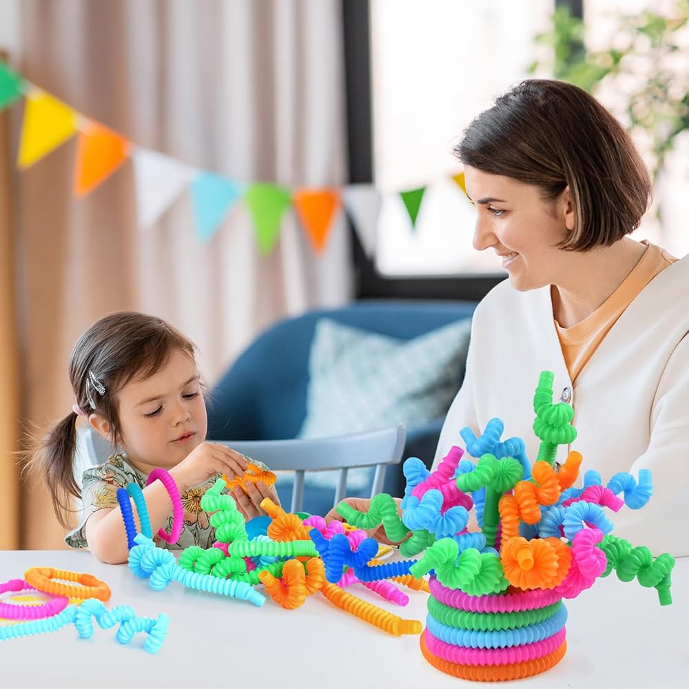 【Sensory Toys for Toddlers 1-8 years】Pop Tubes have Multiple game modes By connecting, stretching, rotating, and twisting, one can freely stretch and deform to form different shapes, Can explore more different postures to form bracelets, necklaces, and jump ropes, providing endless hours of fun and creativity.