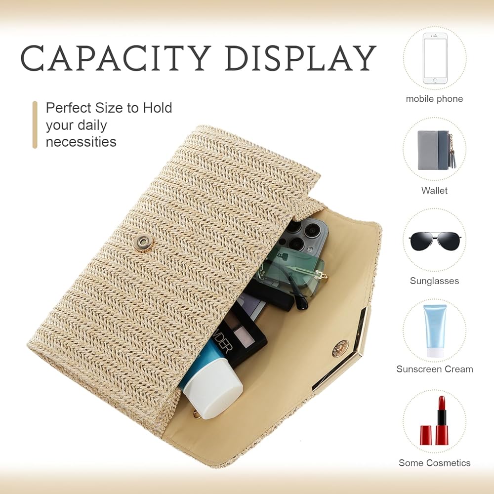 Capacity: The straw clutch has perfect size to hold your makeup, wallets, mobile phone, keys and other daily essentials. With this straw bag, it can satisfy all your beach necessities.