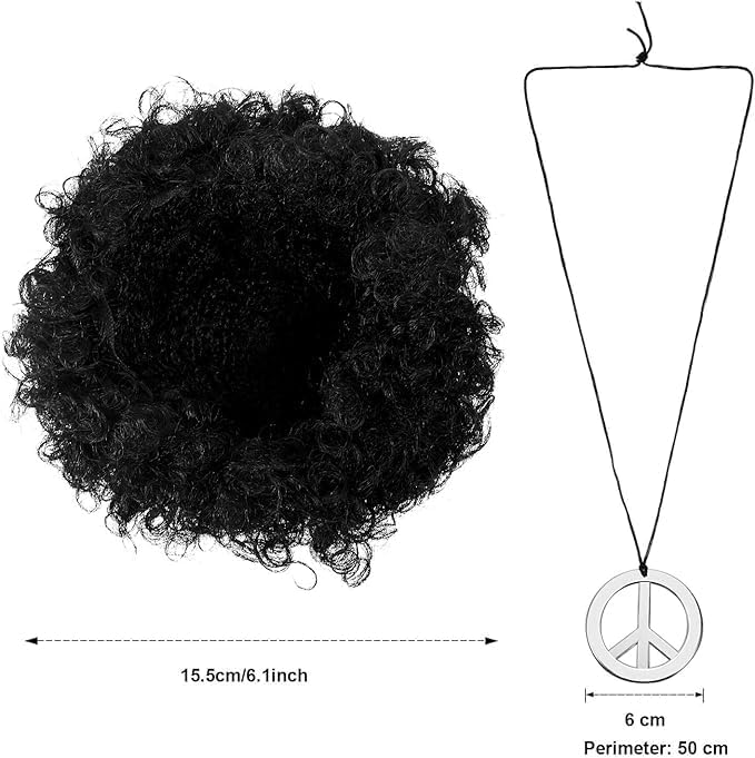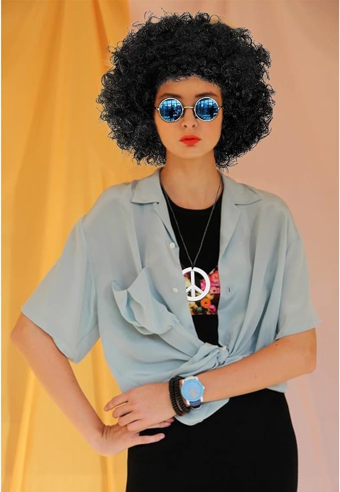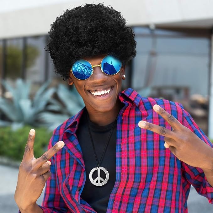 Package includes: 1 pack black jumbo funky Afro wig, 1 pair of hippie sunglasses, 1 piece peace sign necklace