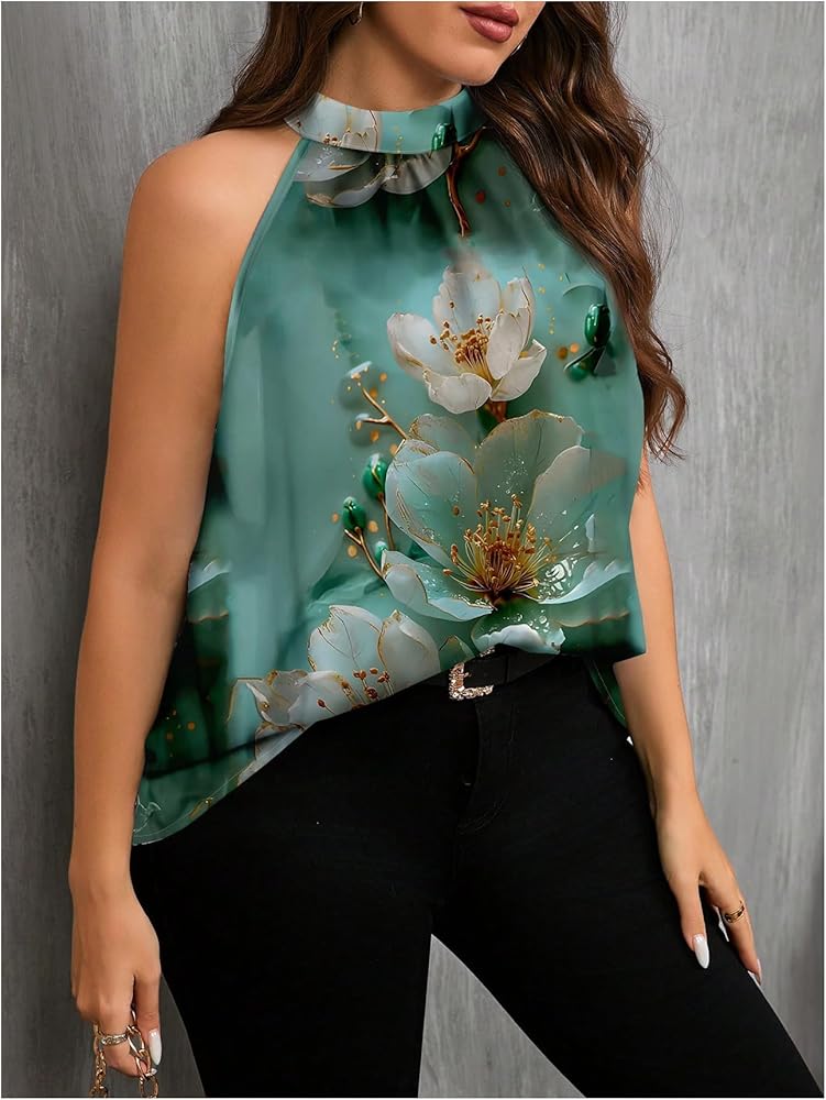 Women's Tropical Paisley Print Halter Blouse Sleeveless Boho Shirt Tops Button Back Vacation Tops