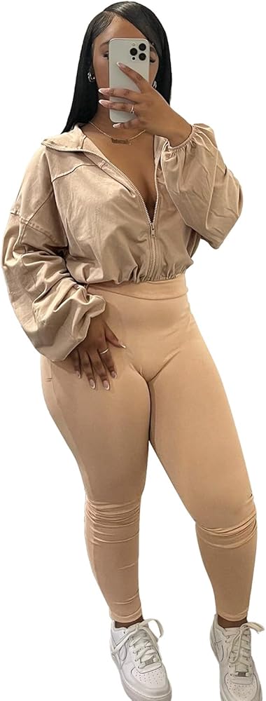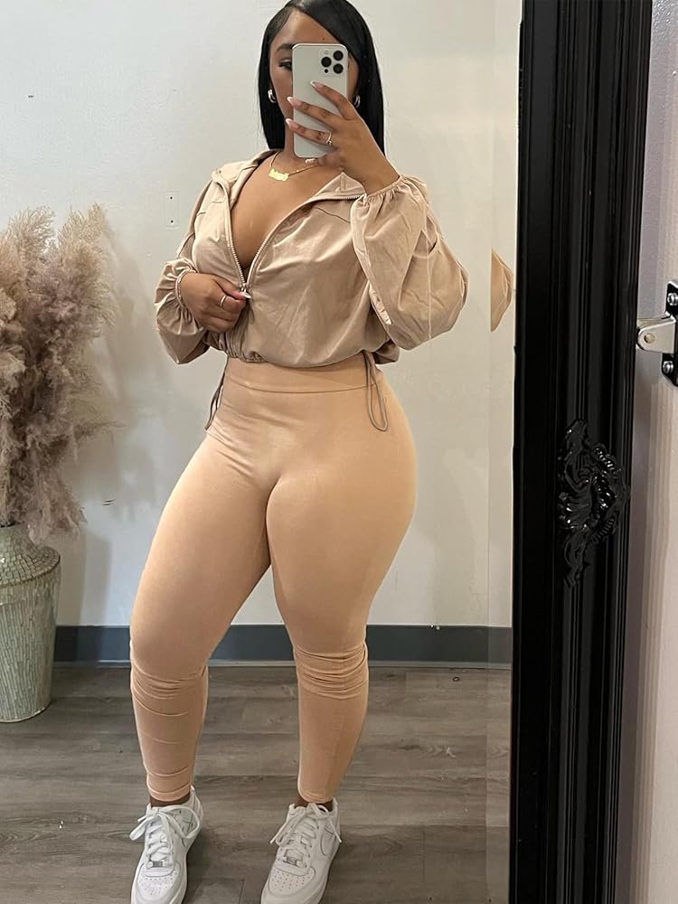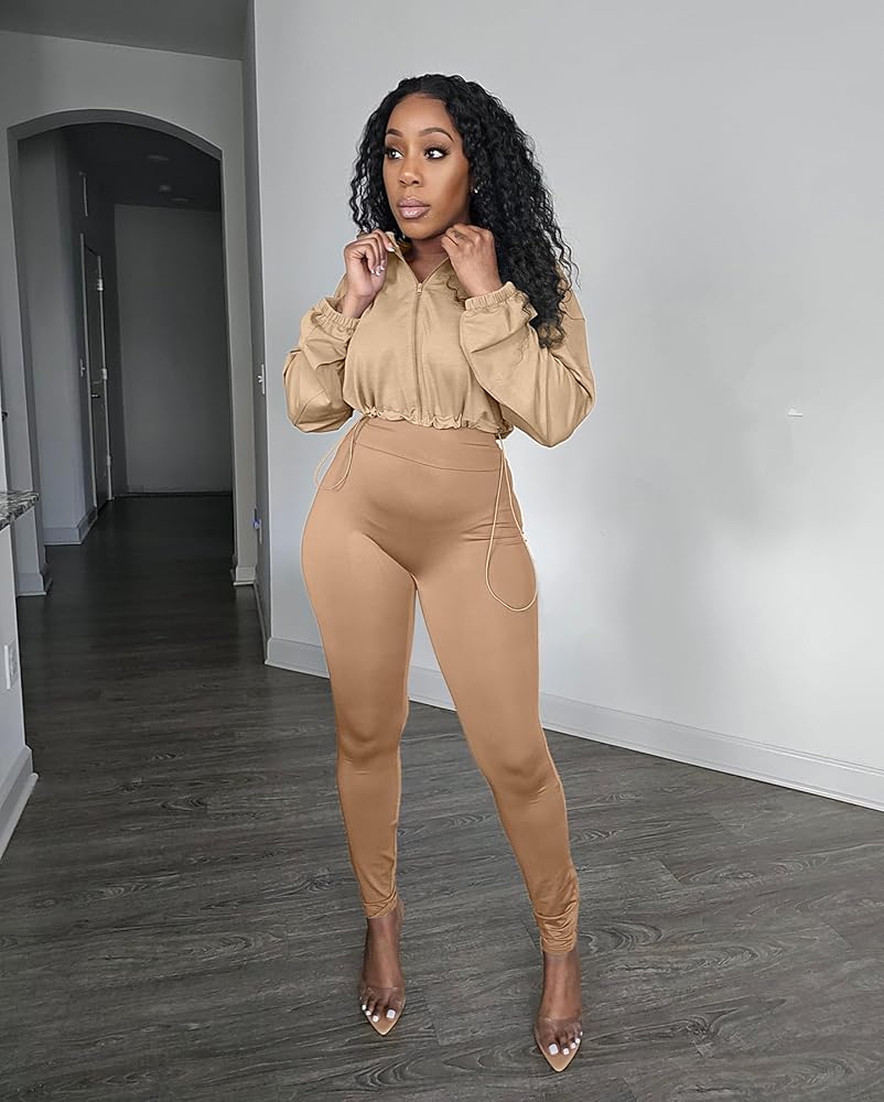 Tips: womens 2 piece outfit tracksuit, zip up long sleeve drawstring crop jacket top bodycon leggings pants sets, casual sweatshirt 1.S=US 4-6, M=US 8-10, L=US 12-14, XL=US 16-18, XXL=US 20-22 2.Machine washable and hand washable in cold water, hang or line dry
